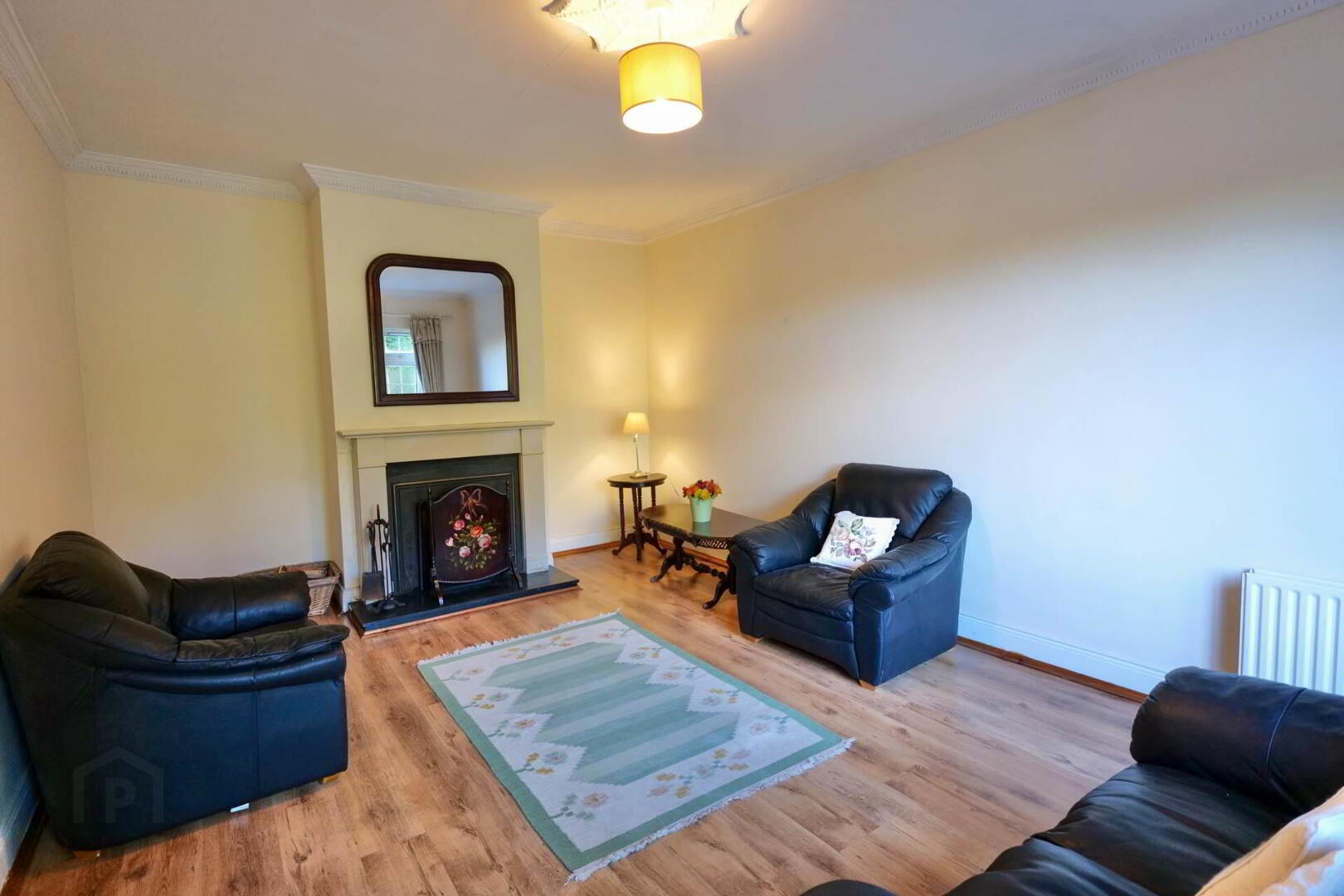 5.6m x 3.8m Timber floor, marble fireplace with cast iron insert, coving, centre rose, radiator, curtains
