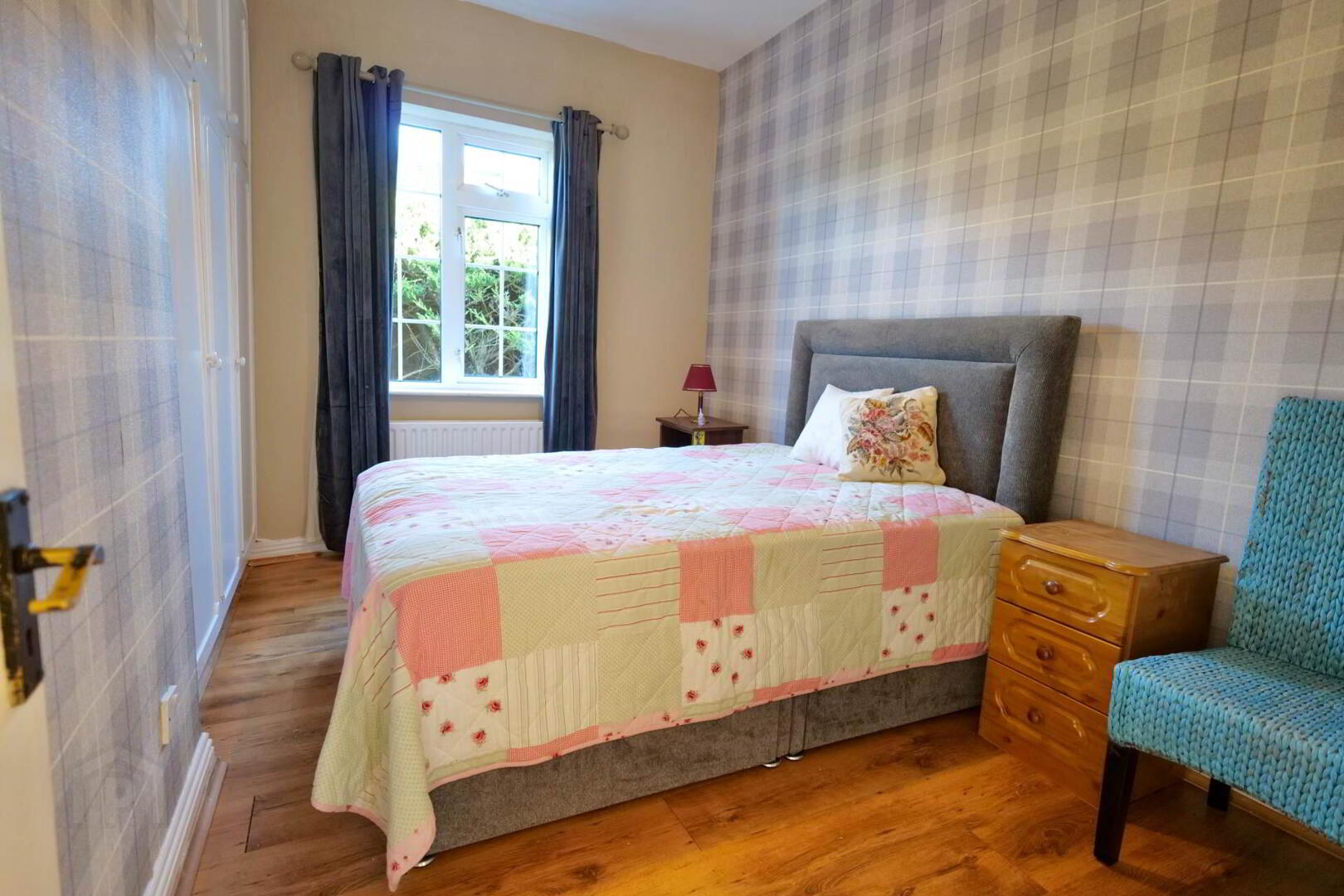 3.8m x 2.6m Timber floor, built-in wardrobe, power points, radiator, curtains