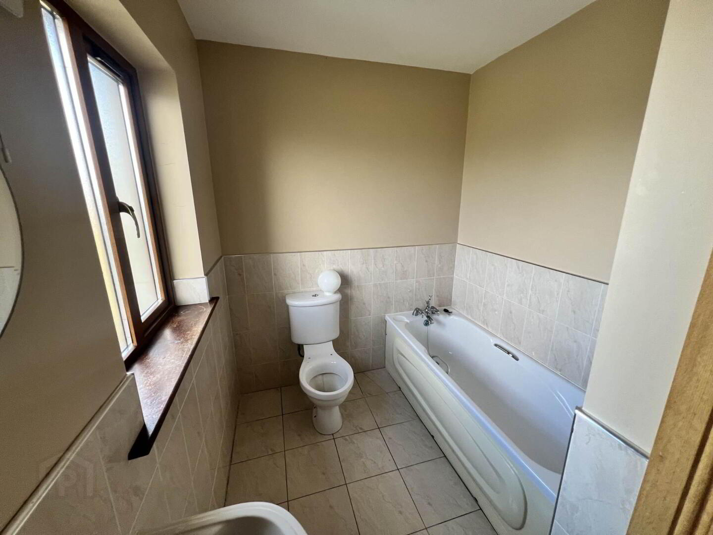 Tiled to half height and with tiled floor and matching bath, toilet and wash basin