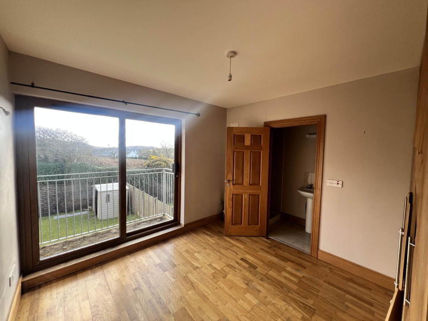 Large double bedroom with balcony and ensuite shower room with tiled floor.