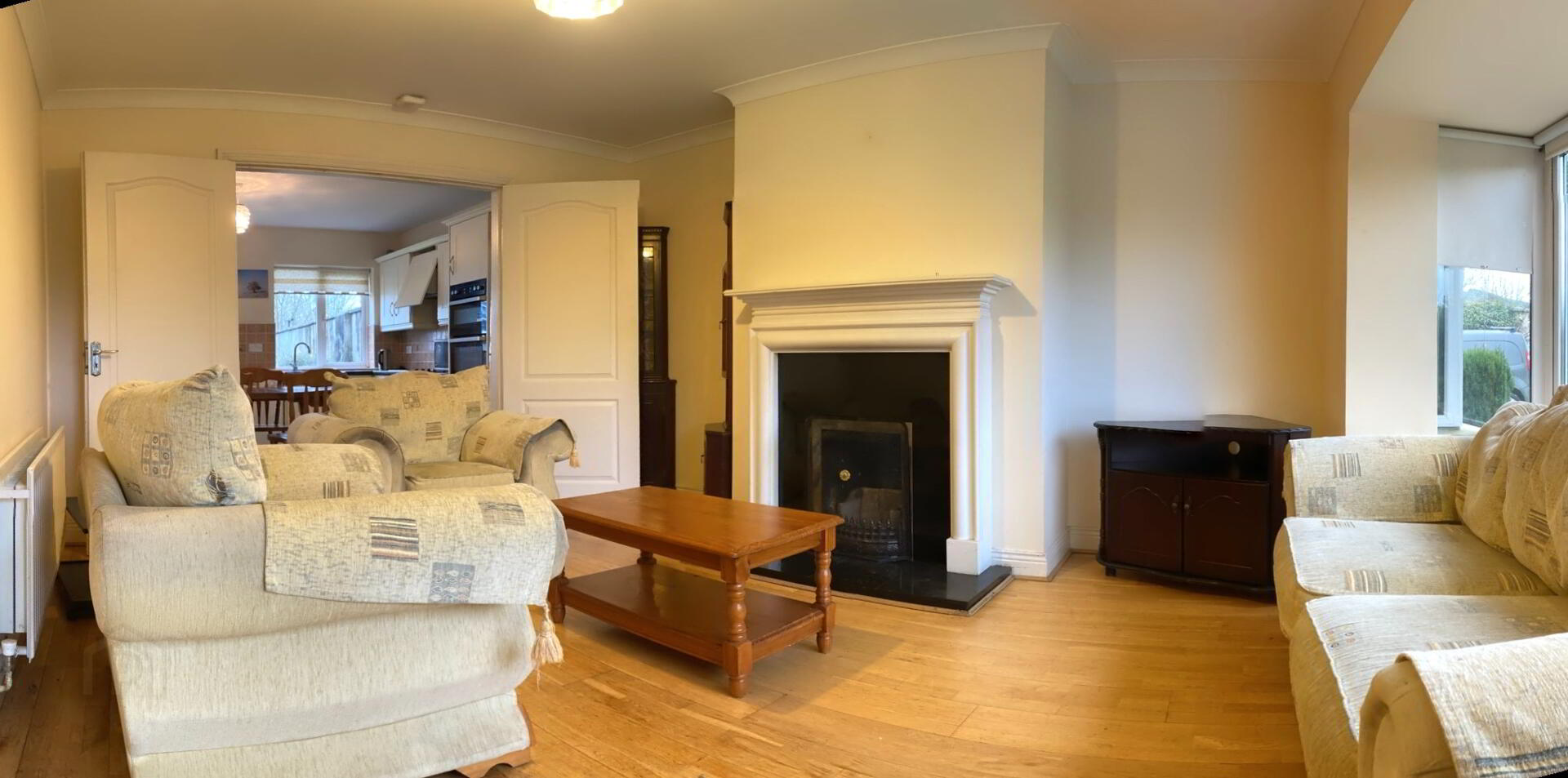 Lounge: Feature bay-window brings awash of natural light. Looking onto the large open space and appealing views of Baltinglass Hill. Feature open fireplace, suitable for a solid fuel stove.