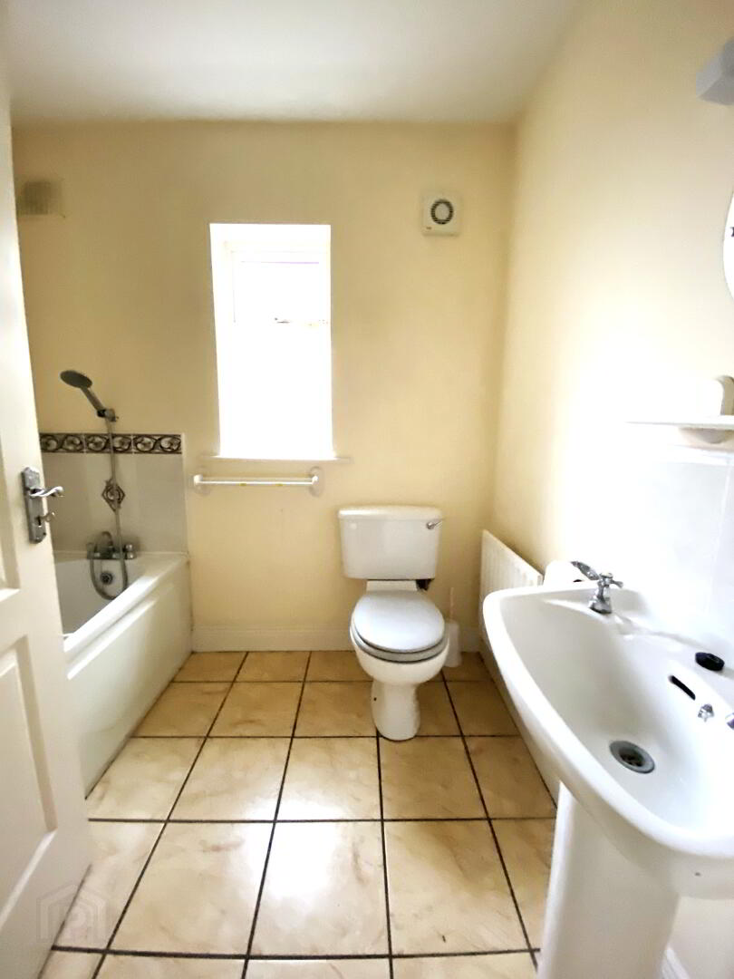 Main Bathroom: Tiled floor and part-tiled walls. Fitted Bath with over-Bath Shower. Toilet. WHB.