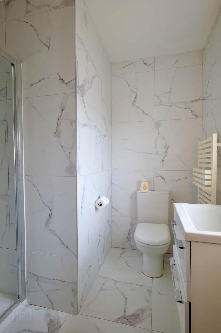 WC, WHB, Electric shower, heated towel rail, built in shelving, fully tiled