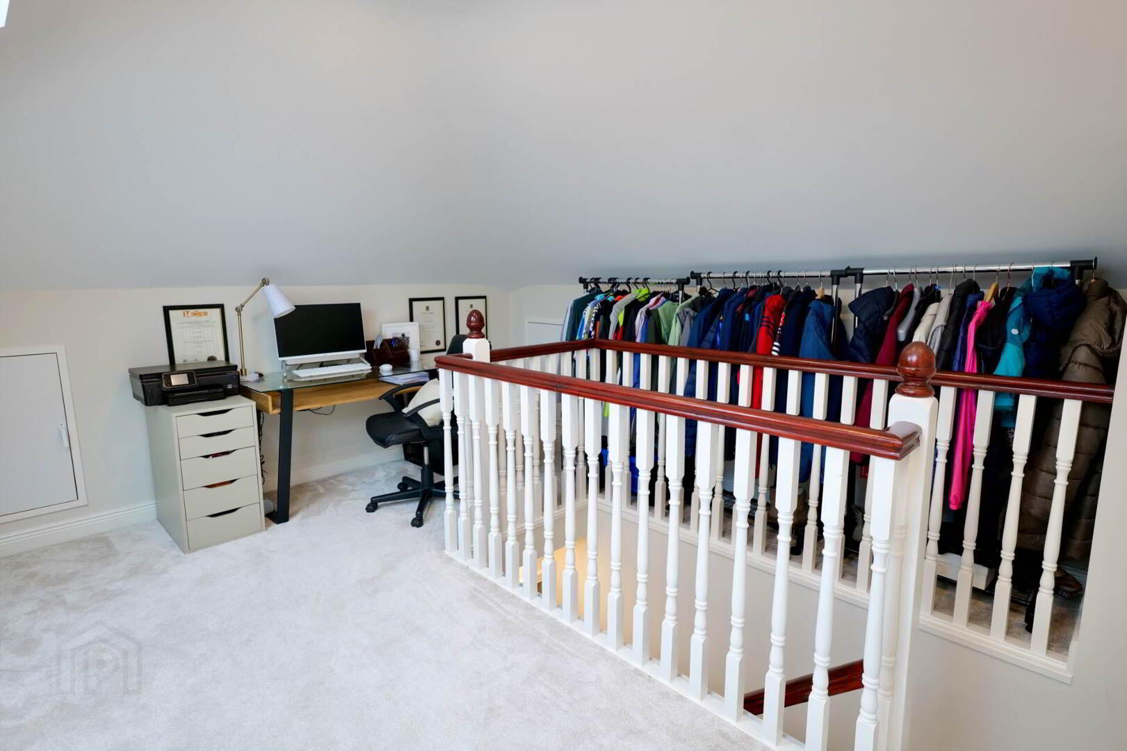 Velux windows, electric heating, extra storage in alcoves, carpet flooring