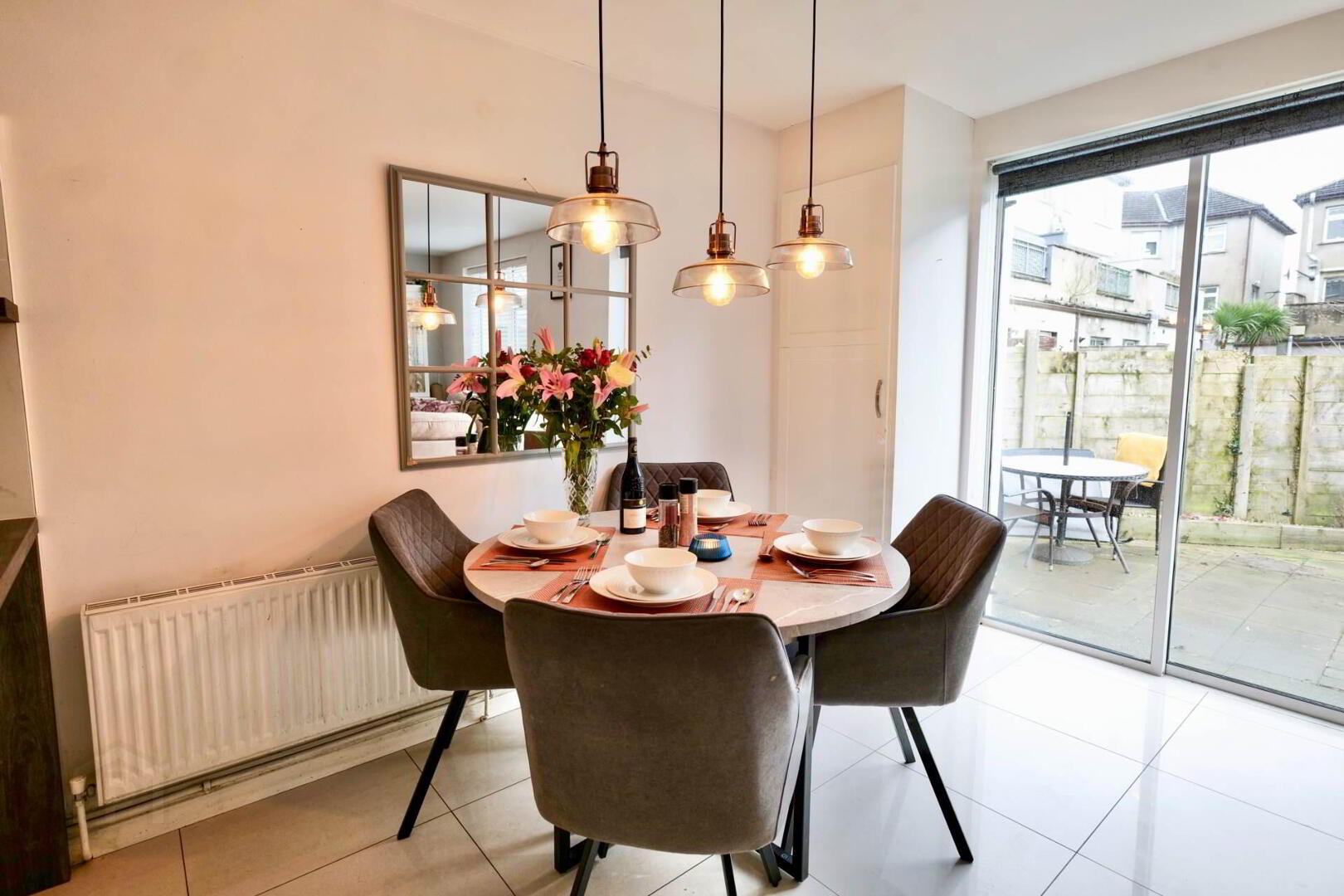 Recently fitted kitchen with integrated appliances, gas fire with feature granite surround and hearth, and tiled floor