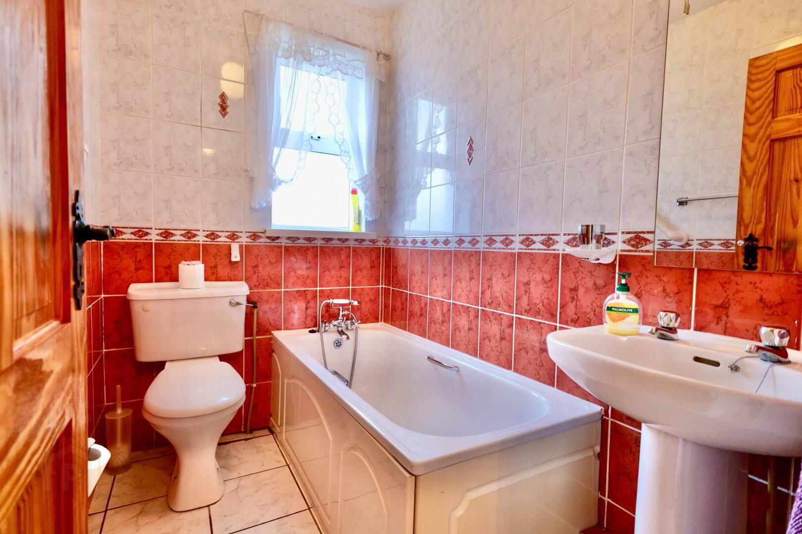 Tiled floor to ceiling with wc, whb and bath