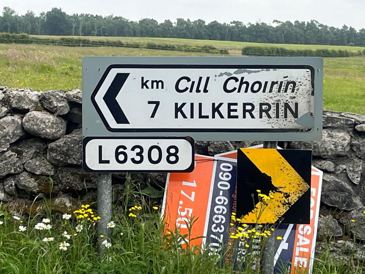 A detached derelict cottage with shed situated in a scenic rural location along a minor road L6308, 7 km from Kilkerrin opposite entrance to Richmond Esker Forest, 400m from junction (see photo with signs).