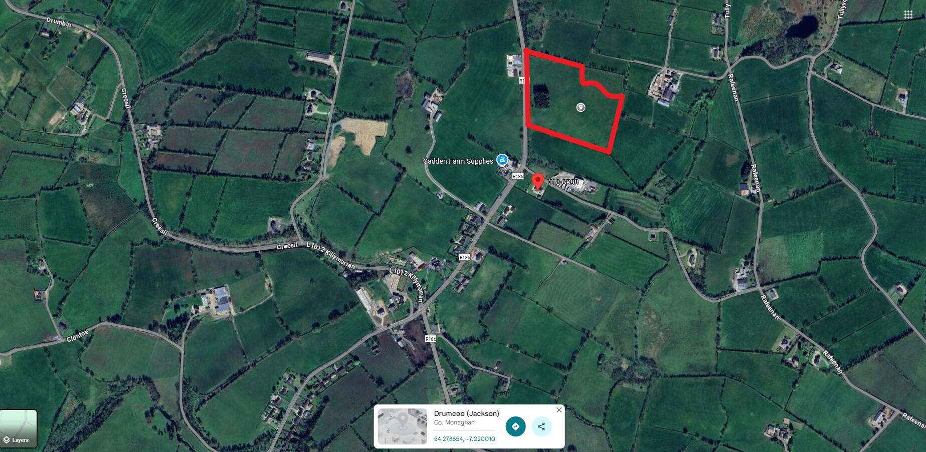 Nice parcel of land with possible residential site subject to the necessary planning permission situated along the R186 Monaghan to Tydavnet road, 7 km north of Monaghan town, convenient to Ballinode and Tydavnet villages, in prime residential location.