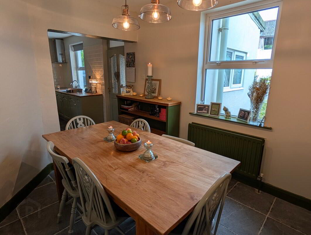 Ground Floor: Entrance Hall (4.3 x 1.0), Kitchen (4.4 x 3.5) with under stair storage & open to Dining Room (3.7 x 2.6), Spacious Sitting Room (5.7 x 4.3) with solid fuel stove & Bedroom 3 (3.7 x 2.8).