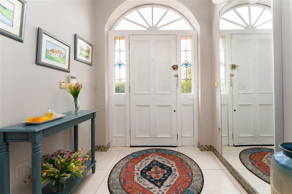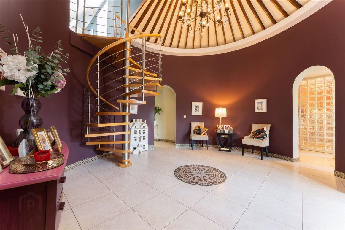 It is approached by a short,gravelled driveway from a recessed entrance with electric gates ensuring full privacy and is surrounded by mature trees and gardens affording excellent options for peaceful repose and family living.
