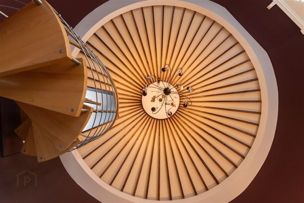 A spiral staircase in the hallway facilitates access to the upper main bedroom accommodation.