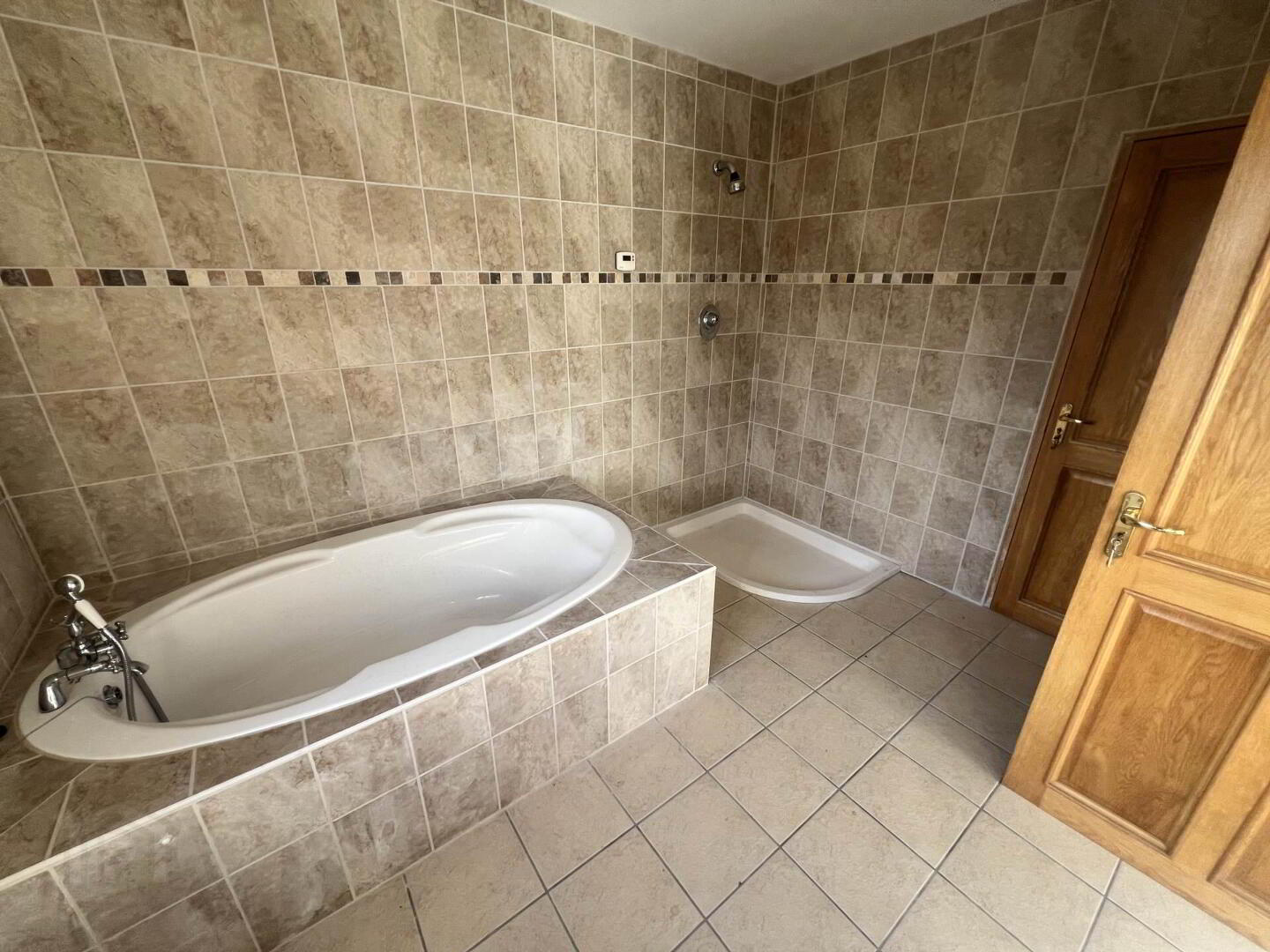 Fully tiled with matching , Shower, Bath, WC and WHB.