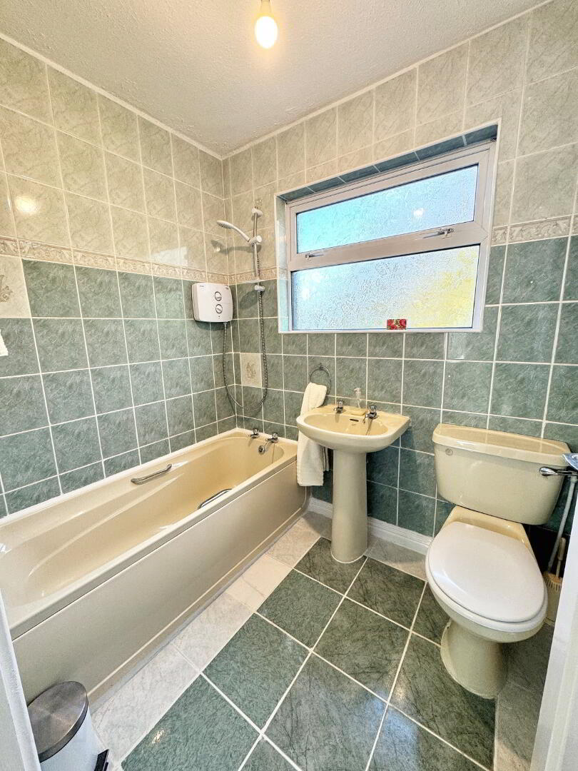 Bathroom: (1.7m x 2.1m) Tiled bath, WHB, WC, Electric shower