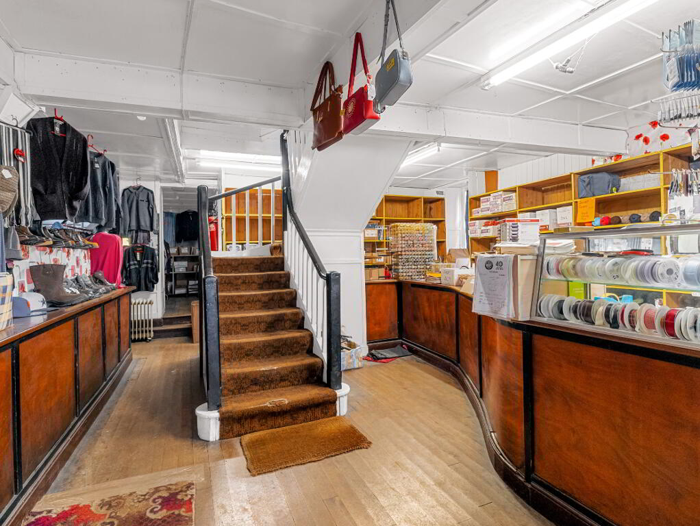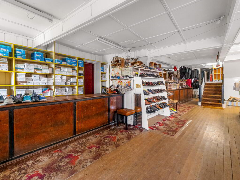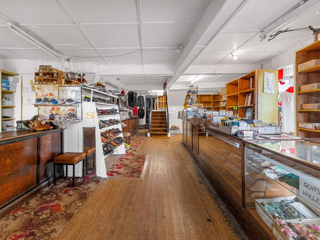 Spacious shop area with large display windows, counters, and timber flooringMany original features intactStaircase leading to first-floor shop area with changing roomsTwo store rooms adjacent to the main shopOfficeKitchenDining area