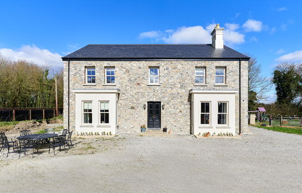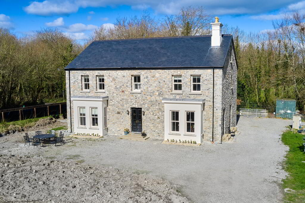 The building was designed to be A Rated, with positive environmental and economic implications, with Air to Water system and heat recovery system first fix. Sash windows throughout being assembled and installed by the renowned Munster Joinery. The intricate and painstaking stonework and pointing was undertaken by a single local stone mason using local stone reclaimed from a 200 year old building in the nearby townland of Slane. Extensive care and attention to detail has gone in to ensuring this new build property appears every piece the part a Georgian residence, and its execution is flawless.