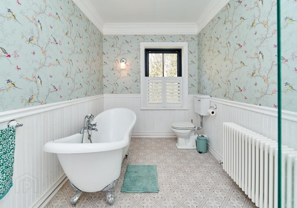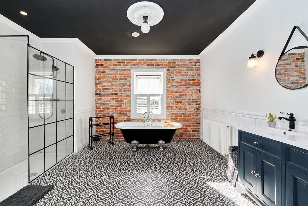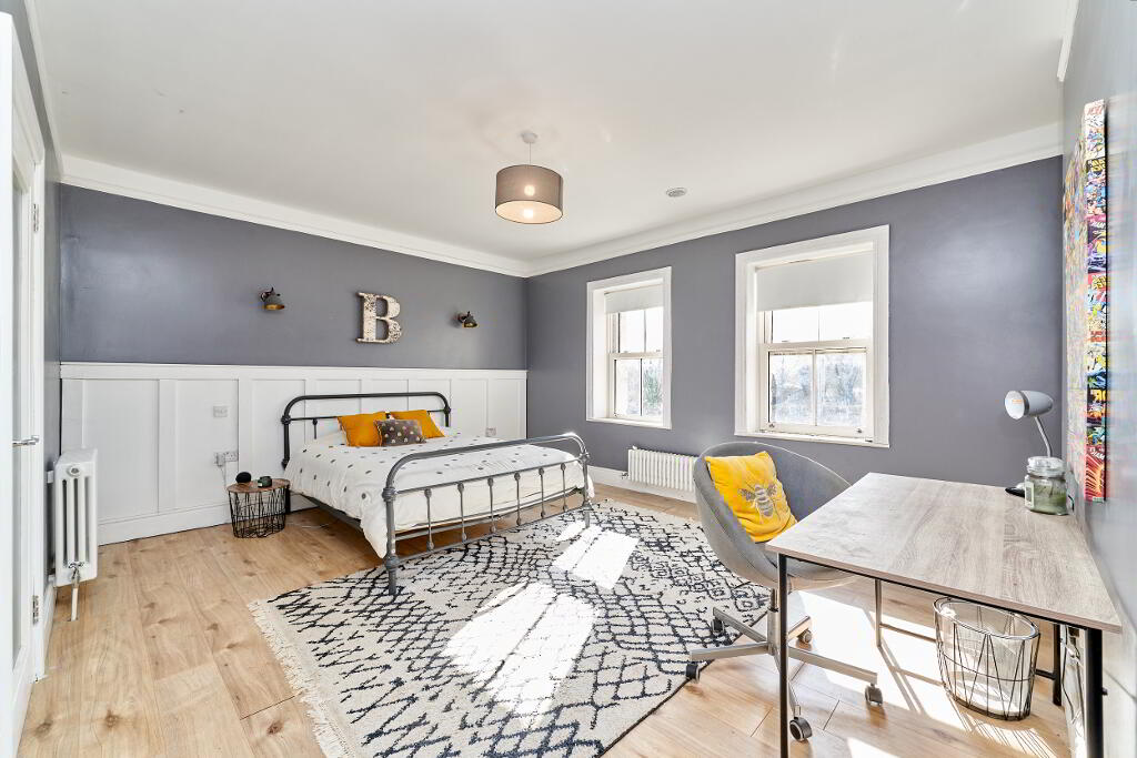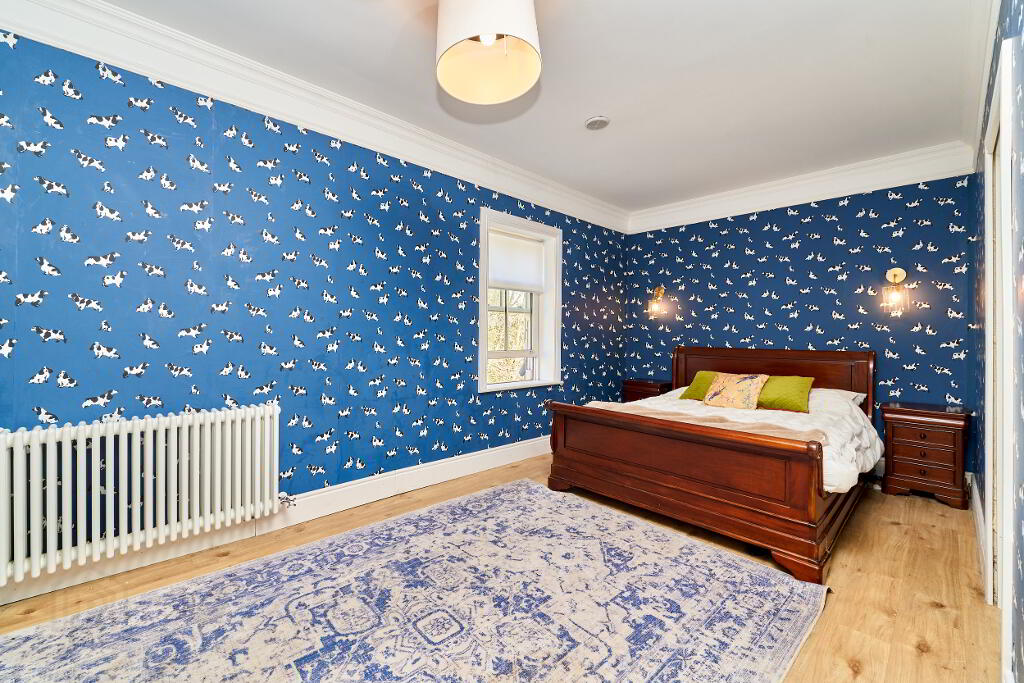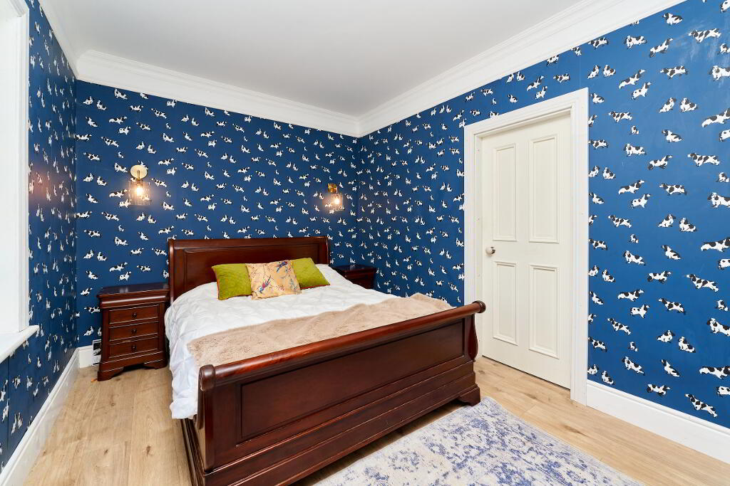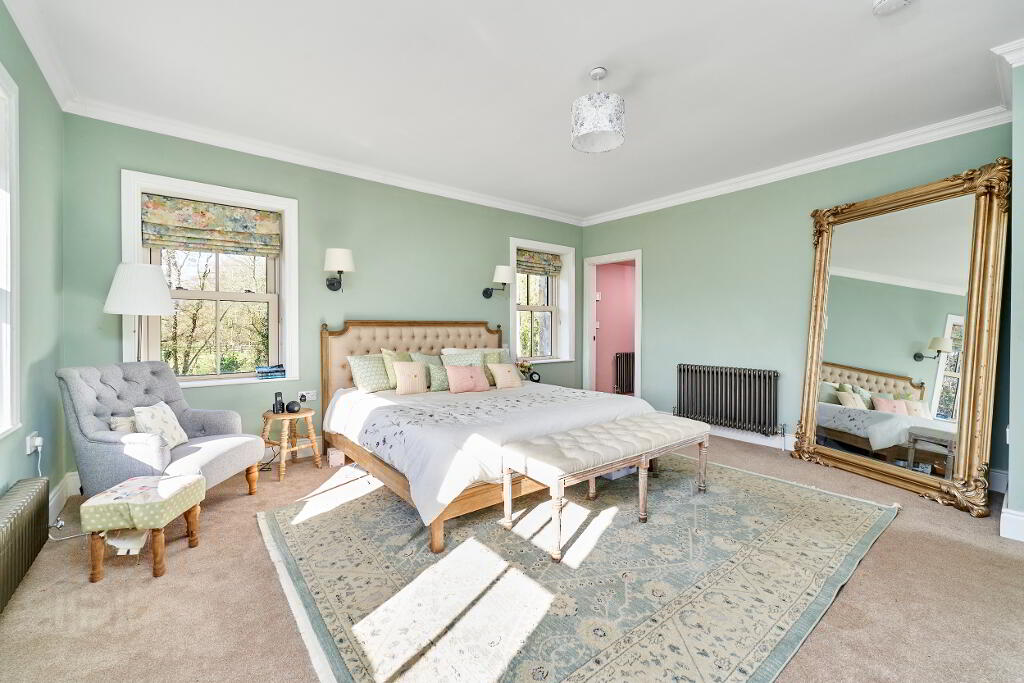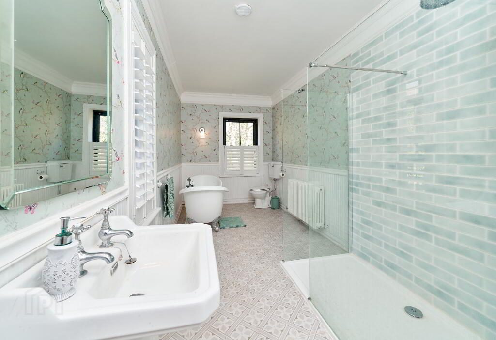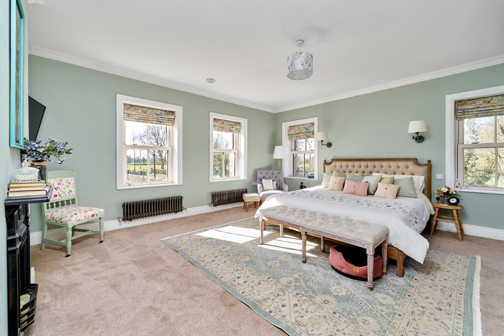 The West wing of the residence is dedicated to the master suite, encompassing dual aspect sash windows and an original fireplace salvaged from the cottage, having seen extensive restoration. The bedroom guides through to a spacious walk in wardrobe come dressing room and finishes in a spacious en-suite, with a further walk in shower and claw foot bath, once more finished with Parisian style tiling and paneling.