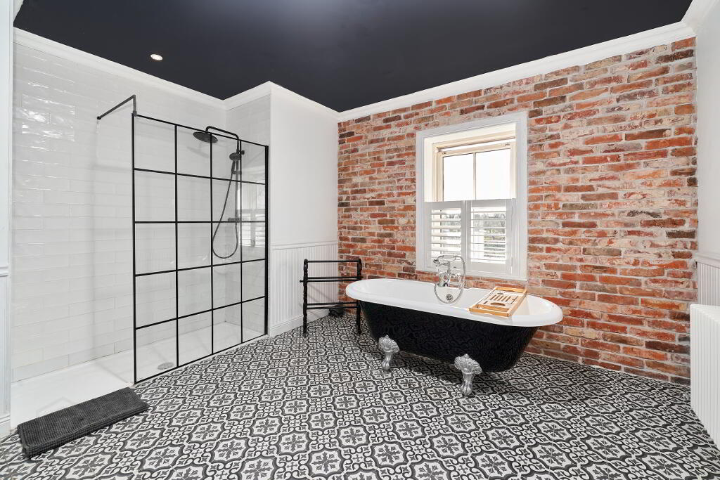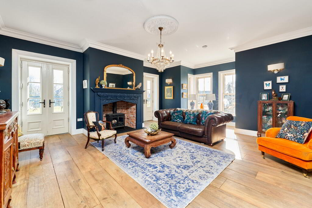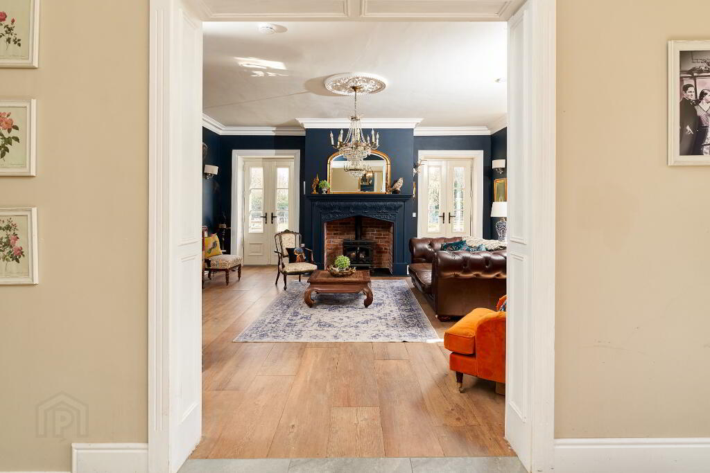 The main guest entertaining room is a triumph, with framed and paneled opening leading from the hallway the eye is instantly drawn to the commanding, brick-lined fireplace and its statement piece ornate mantel. Being dual aspect, with south facing sash bay windows and double French doors, the room is bathed in natural light and features hardwood effect tiled flooring. The steps leading from the French doors, and indeed surrounding the residence, utilize bricks reclaimed from the original cottage, a theme which is present throughout the buildings construction.