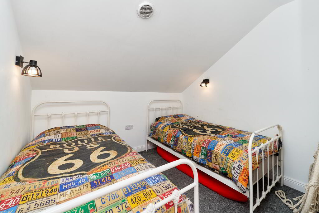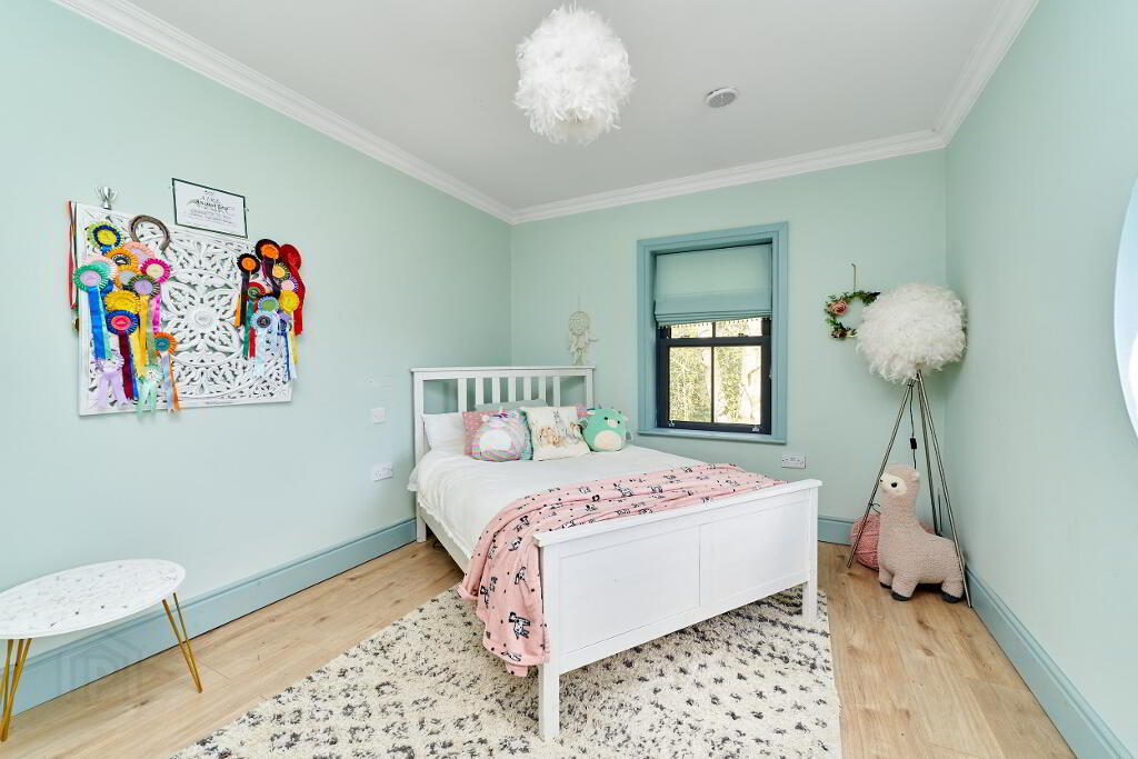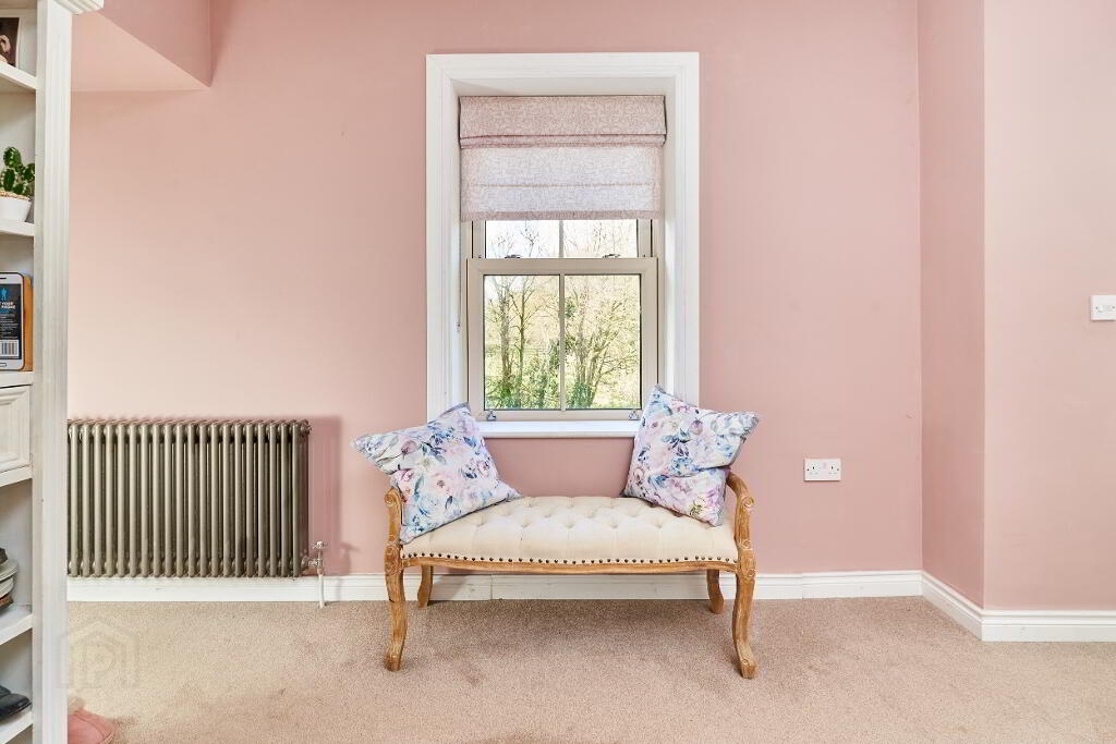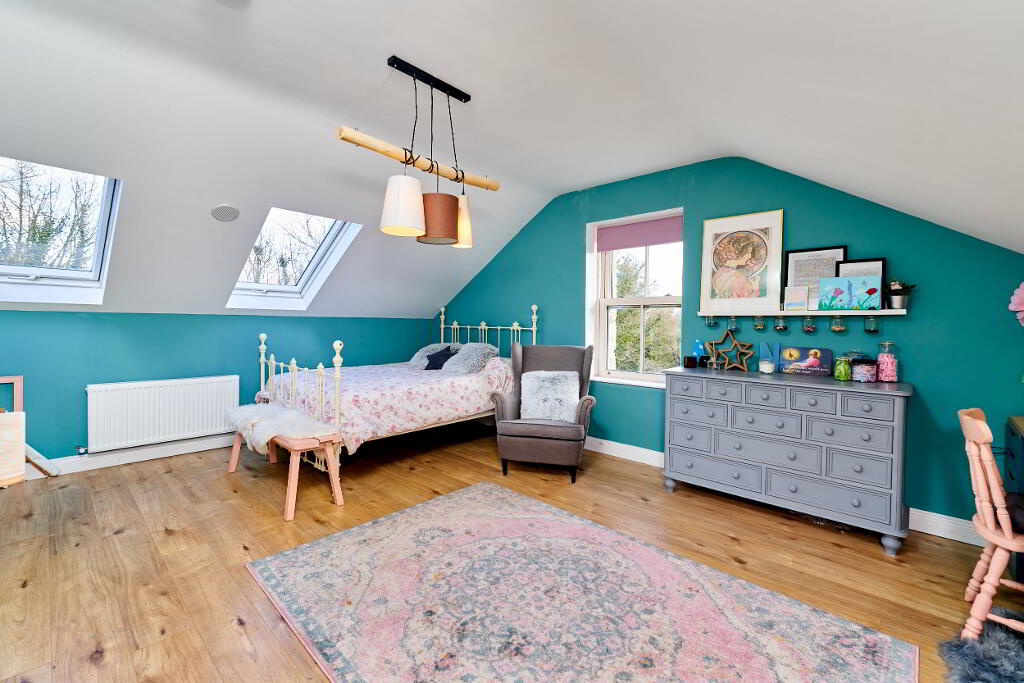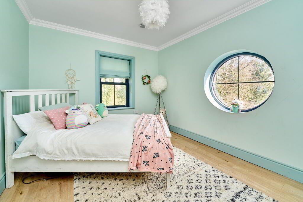 The third bedroom on this floor features its own walk-in wardrobe and a charming round window overlooking the smallholding.