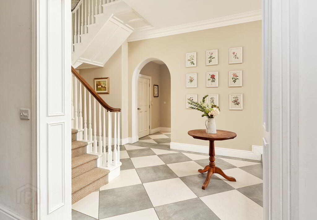 Stepping through the front door one is greeted by a grand, split level entrance hall, with checkerboard tiling, ornate coving and full turn U staircase.