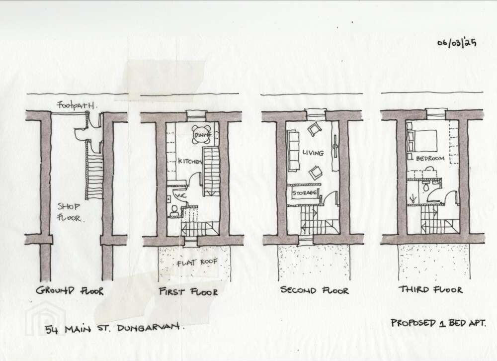 No 54 Main Street provides for 138sq.m of accommodation on four levels. Currently the ground floor provides for the retail space with office and ancillary non stock storage at first floor. Local Architect Emmet Murray has prepared a preliminary design converting the overhead three floors to a spacious studio apartment.