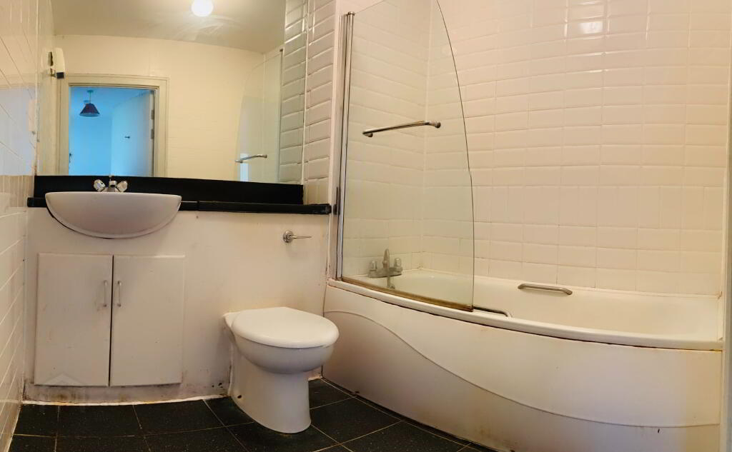 Bathroom: Fully tiled floor and walls. Generous size. Fitted with Bath and over-Bath shower, Toilet, WHB vanity unit, Wall mirror and Extractor.