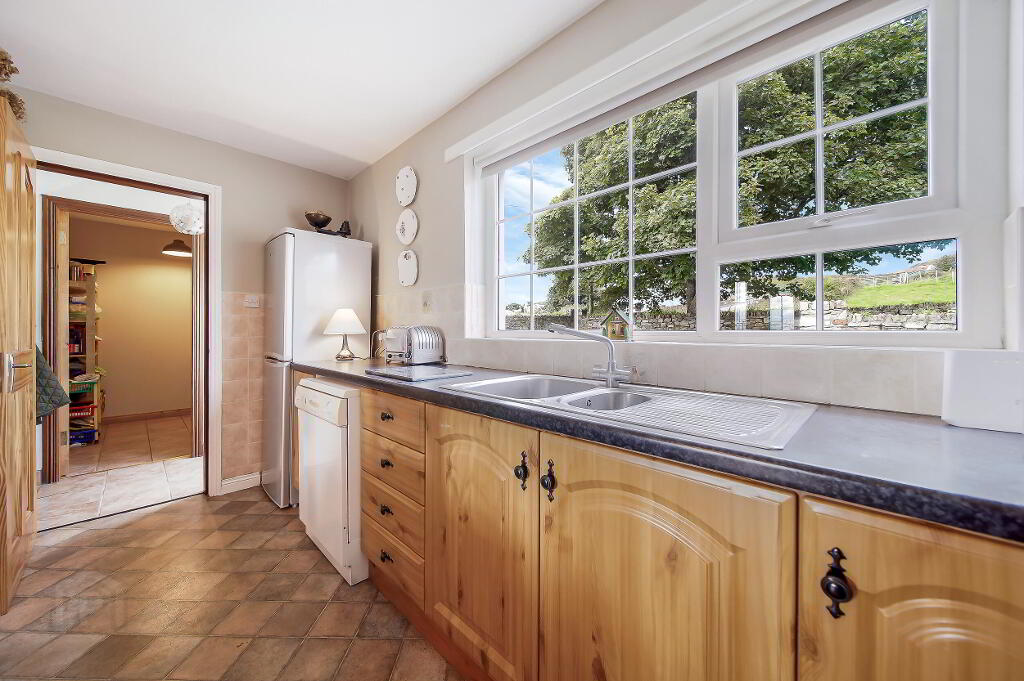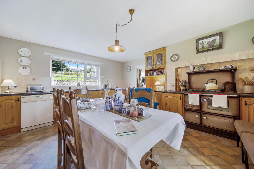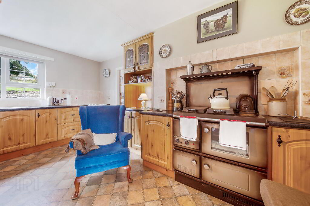 4.70m x 4.00m Fitted eye and low level units. Oil fired Stanley range. Tiled over work surfaces. Electric oven.
