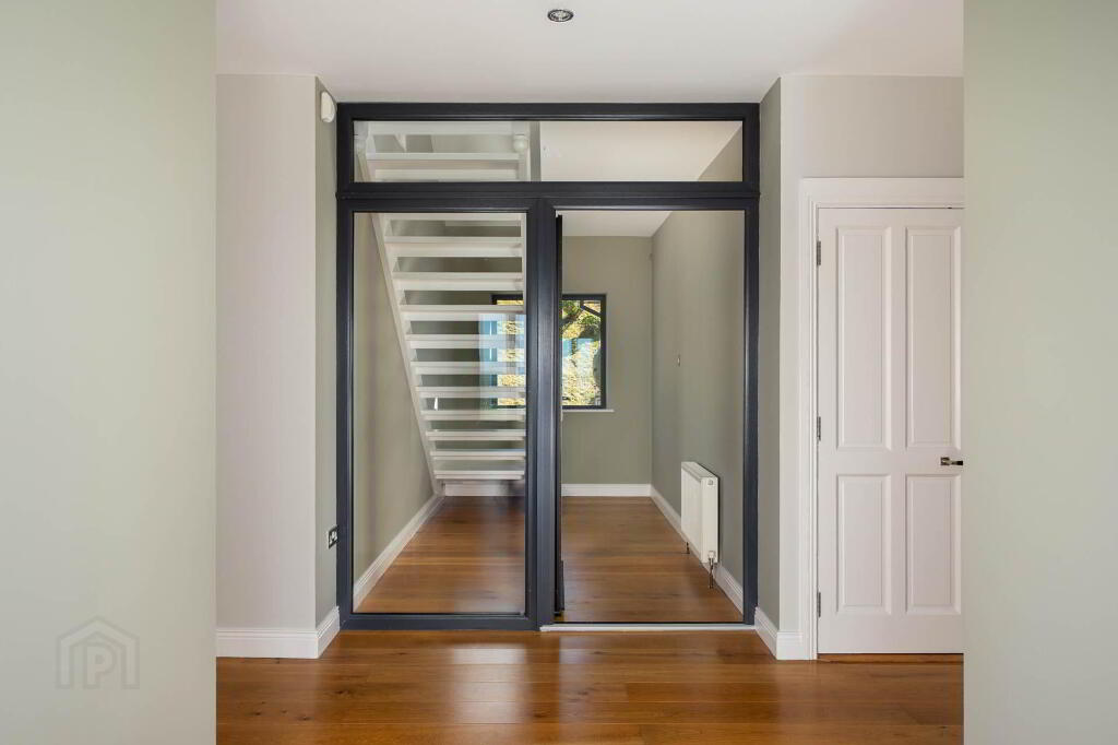 The spacious accommodation is centred around a light filled open plan kitchen, dining, and living area. This impressive space is designed to take full advantage of the lake views, featuring panormaic glazing, solid wood flooring, a gas cooker, quartz worktops, and an electric fire (with an existing chimney that has been sealed). Just off the kitchen is a well equipped utility room with fitted units, a Belfast sink, and plumbing for both a washing machine and dryer, along with convenient access to the rear garden and a guest WC.