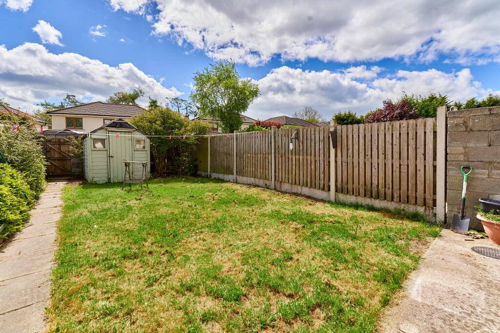 Stepping outside, a low maintenance lawned garden with garden shed with gated access to side entrance.