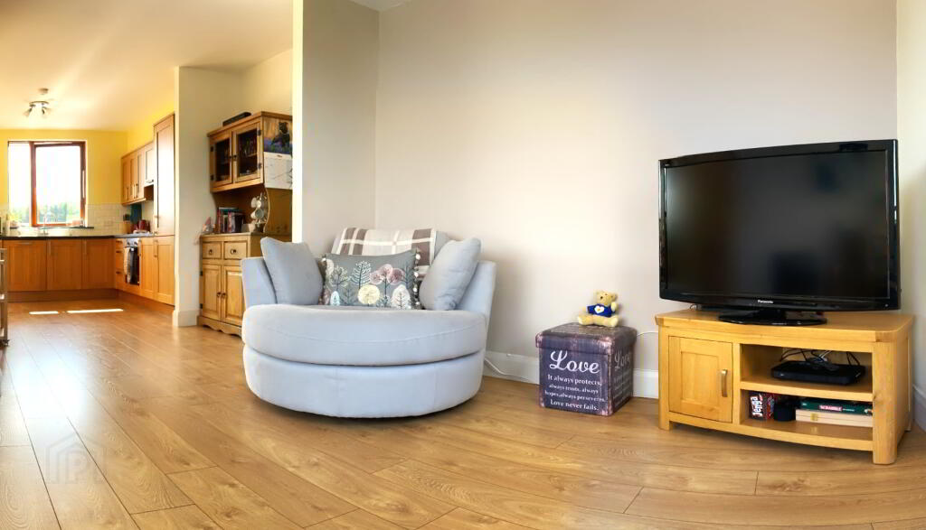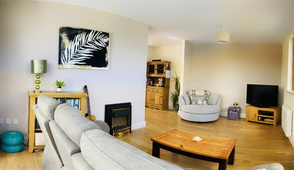 Open-plan Lounge, Dining and Kitchen area of c. 60 sq. meters. A beautiful space awash with natural light. Separate exits onto the south-facing patio area and west-facing decking area. Finished with quality laminate flooring throughout.