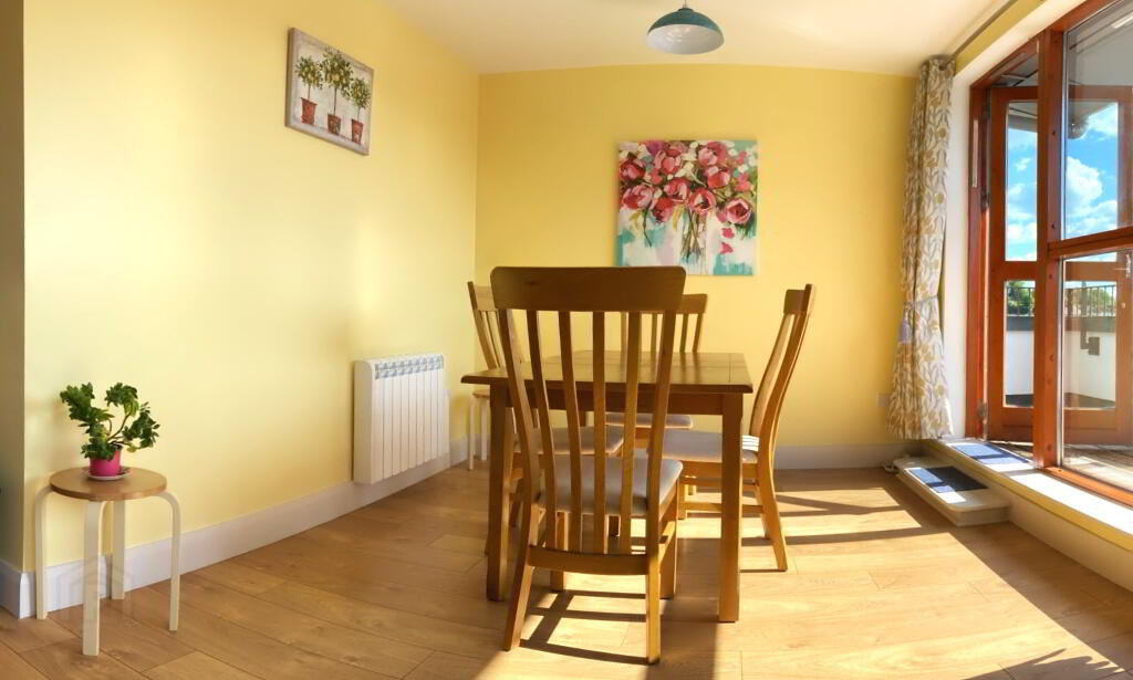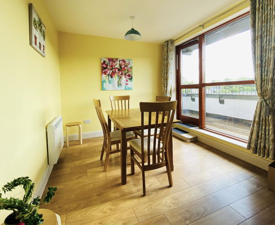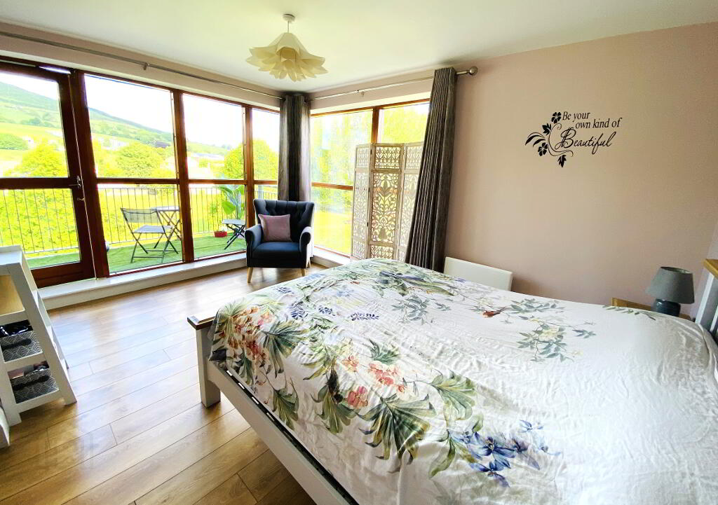 Master Bedroom: A beautiful living space with spacious double Bedroom with large corner window overlooking the River Slaney. Easterly facing balcony for the morning coffee. Dressing area with fitted wardrobes complimented with a sizable En Suite.