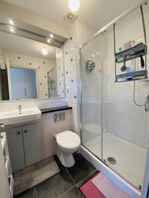 En Suite: Fully tiled floor and walls. Shower cubicle. Toilet, WHB and Extractor.