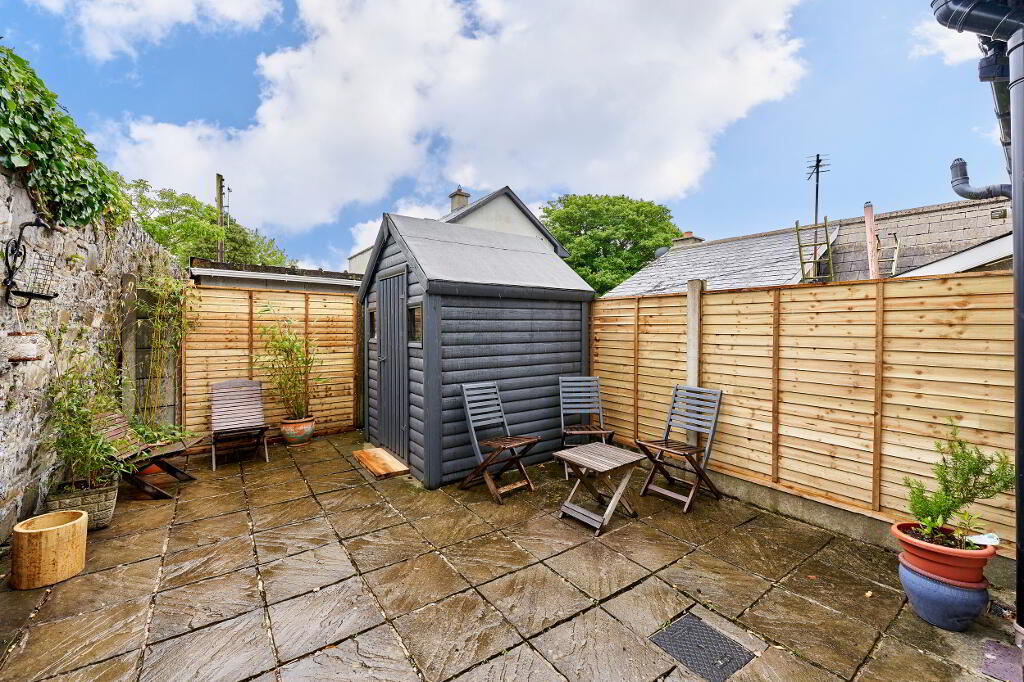 Sitting room gives way to a well-appointed kitchen diner with views over the church spire, hallway leads to a generous downstairs bathroom and access to a neat back garden patio space with potting shed.