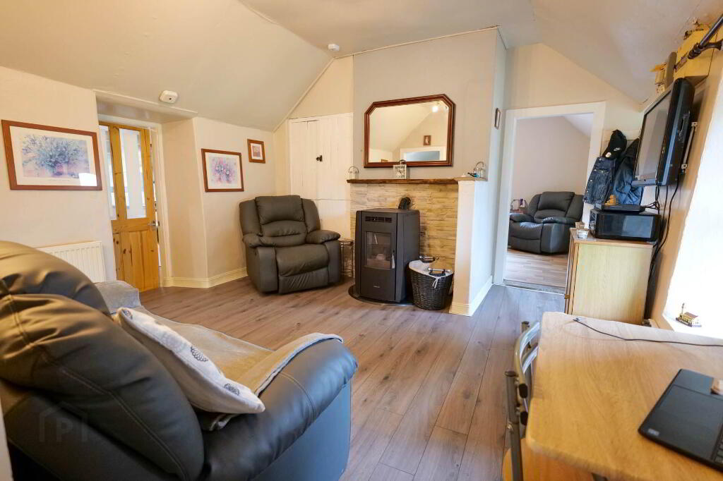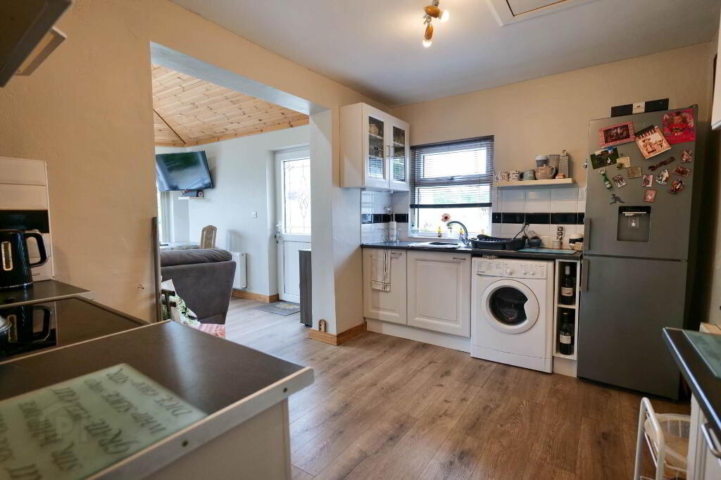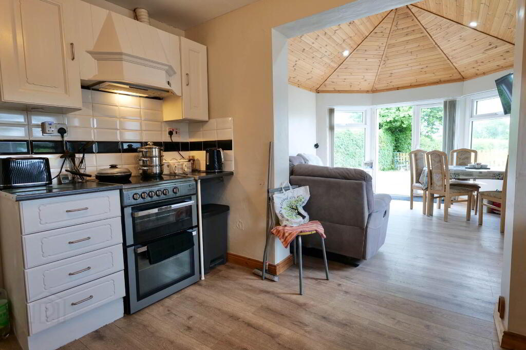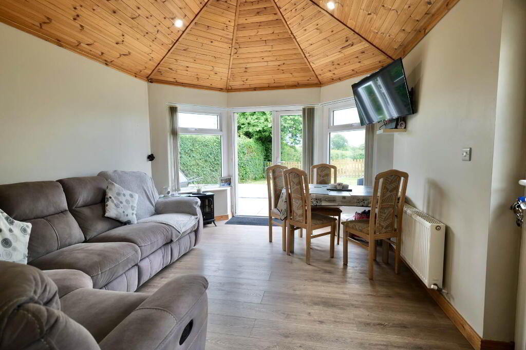 Beautifully finished throughout with a modern décor, the property comprises of a sitting room with pellet stove which leads through into the kitchen, nicely presented with white kitchen units. This leads through into a large bright sun room with laminate flooring and French doors out to the rear patio.