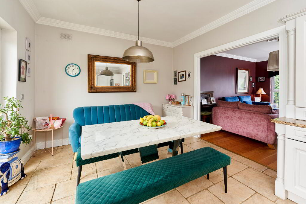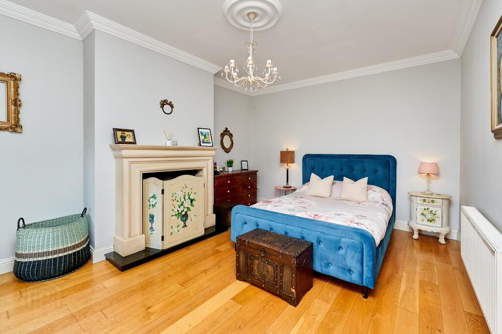 Turning right the main living room is straight out of the pages of a Laura Ashley magazine, with hardwood floors and gorgeous cornice work around the ceilings.