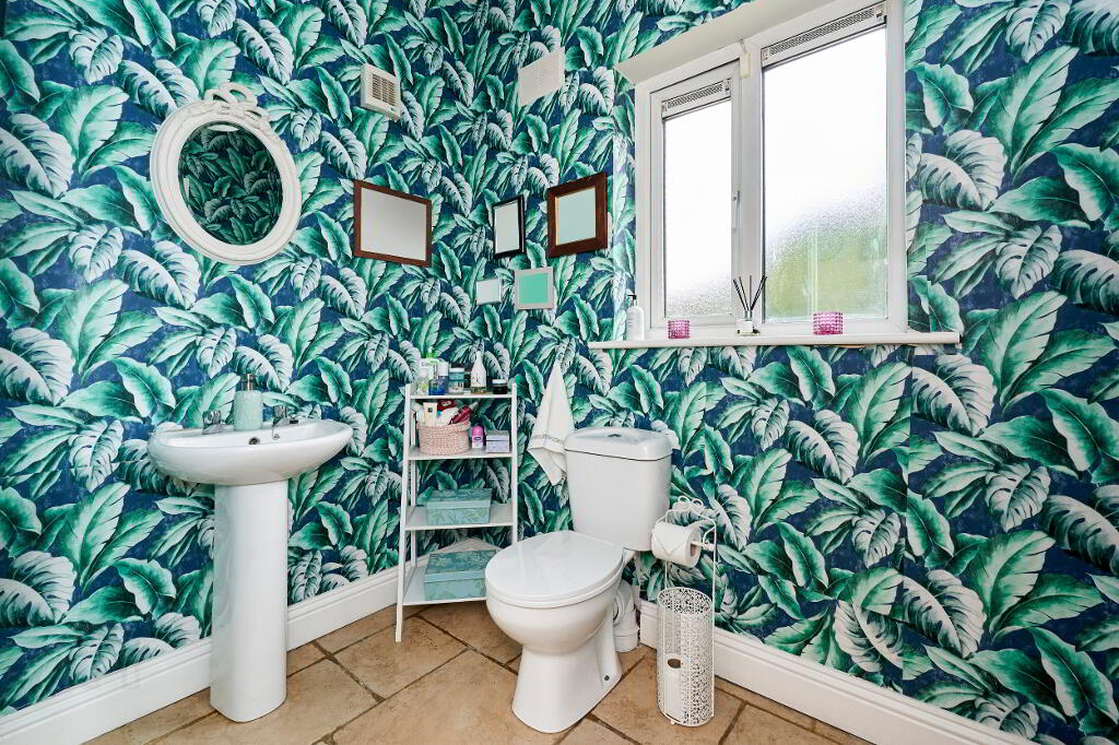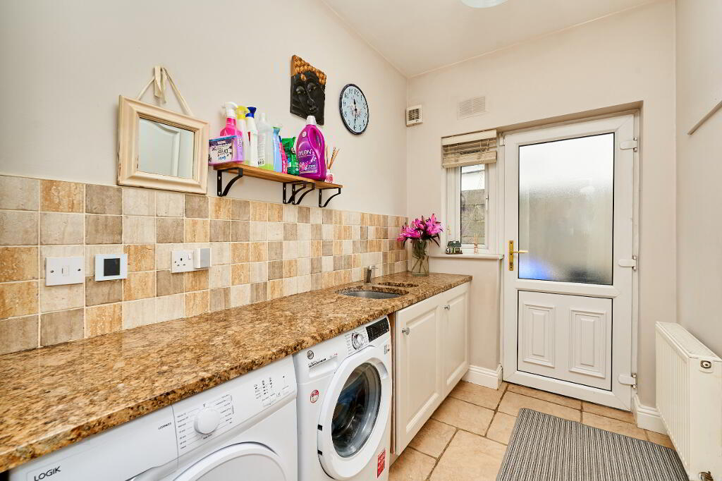 The living room gives way via framed opening to a generous open plan kitchen dining room which is a harmonious blend of traditional, almost country living, and contemporary modern styling, with beautiful flag flooring and a Rangemaster taking pride of place. The kitchen ends with a large utility room being plumbed with sink and worktop that provides further side entrance access and finishes with a downstairs WC.