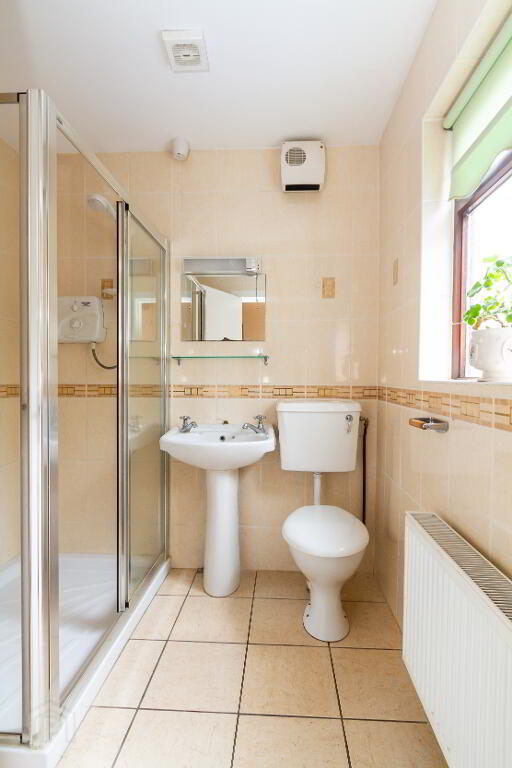Very user-friendly. Fully tiled. Excellent shower cubicle. WHB. Toilet.