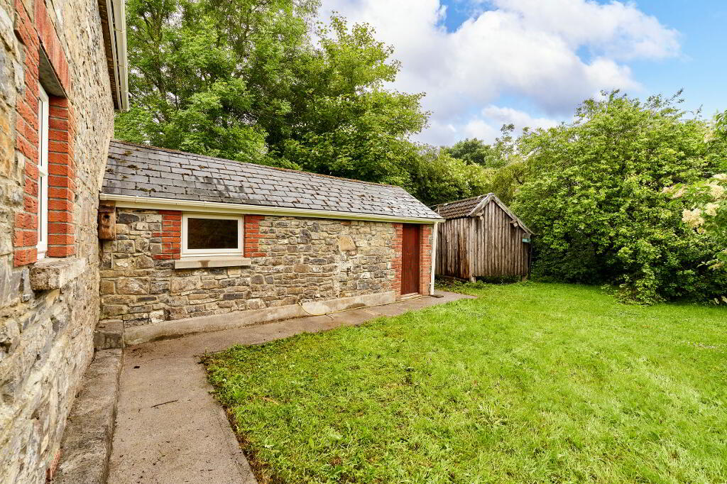 An insulated shed abutting the main residence houses water pump with a further wooden potting shed behind.