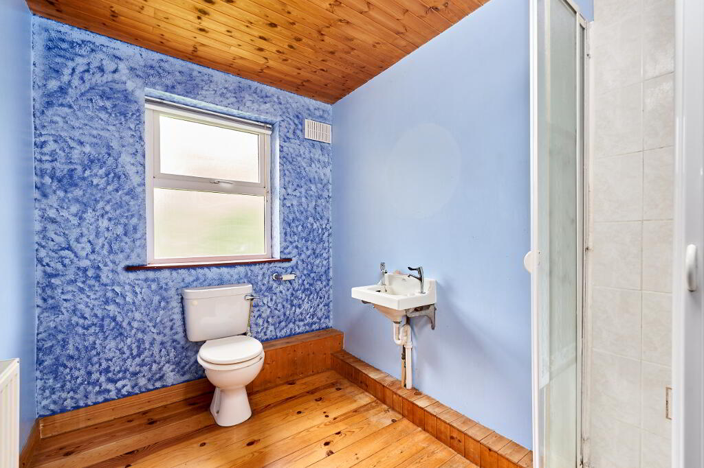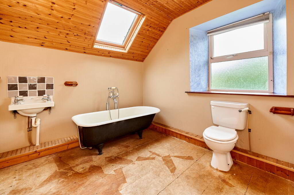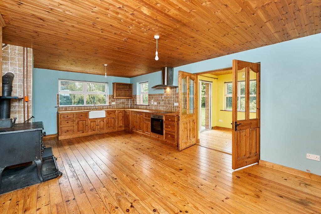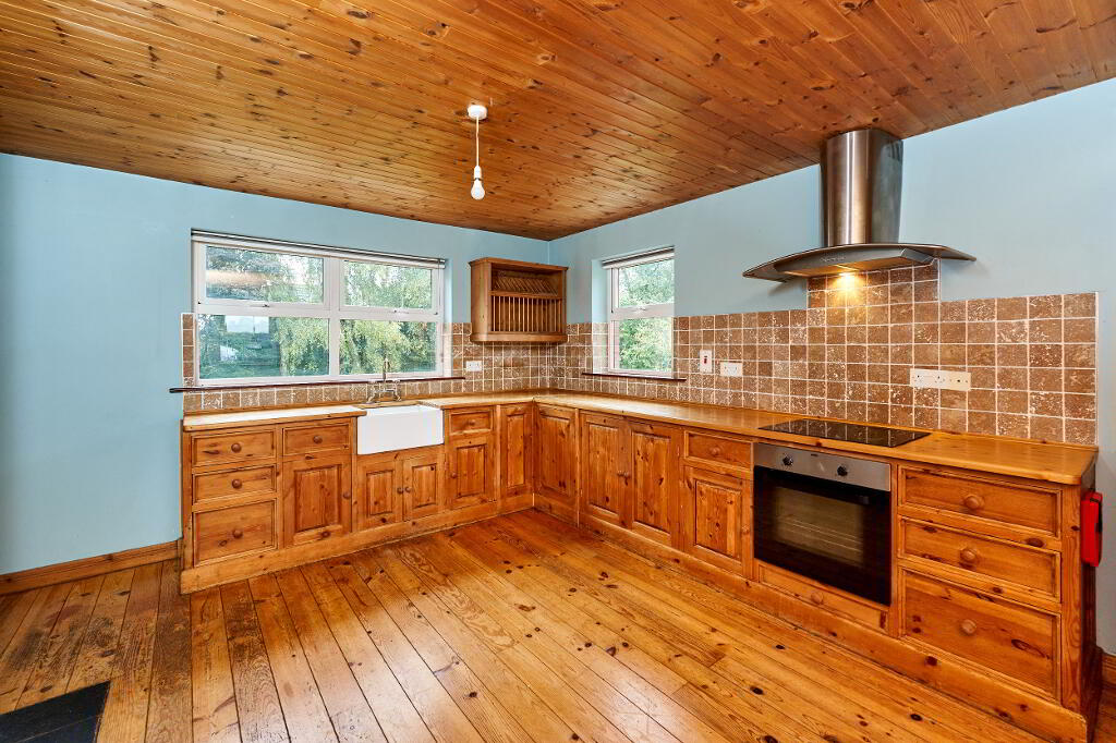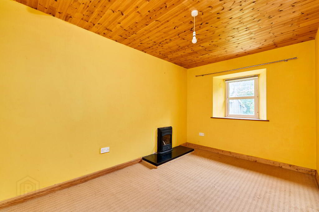 The kitchen gives further access to utility room leading back to hallway, a downstairs bathroom with shower, downstairs bedroom featuring insert solid fuel stove and finishing in a family sitting room, with further solid fuel stove having access to a snug storage or play room.