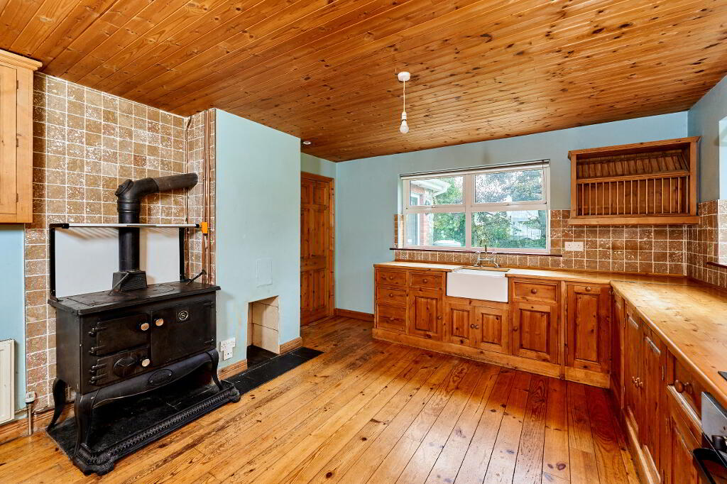 Front door opens to a spacious hardwood floored hallway, guiding to the right and leading to a large country style kitchen, featuring a Stanley range with back boiler and a Belfast sink. Double doors from the kitchen lead to a sun drenched dining room, with views over your new back garden and sliding patio doors.