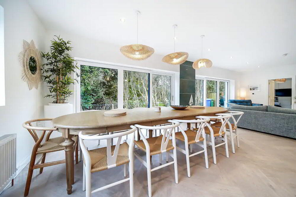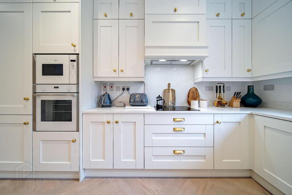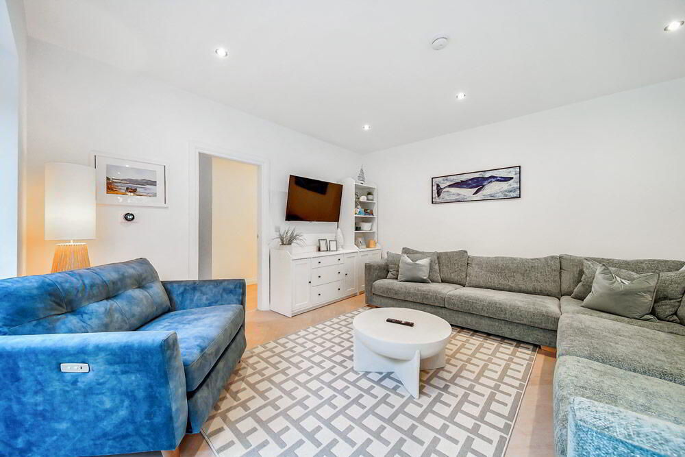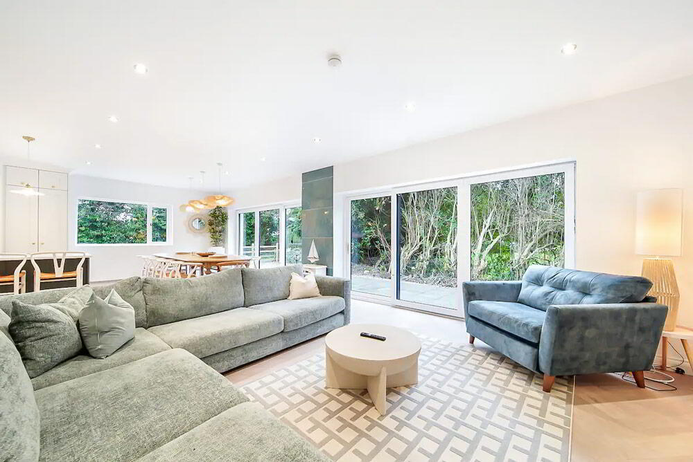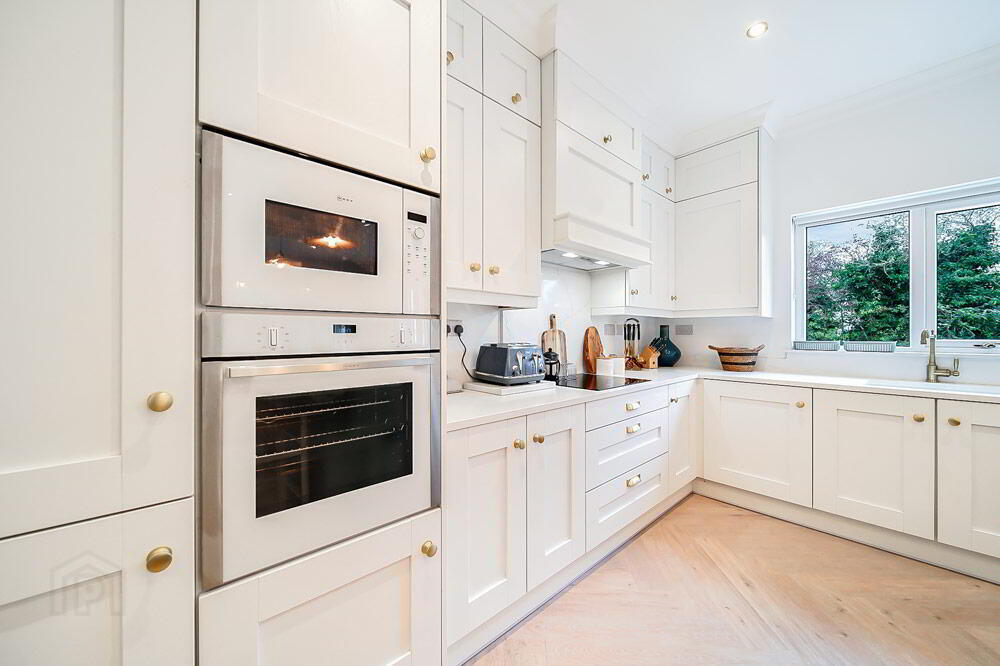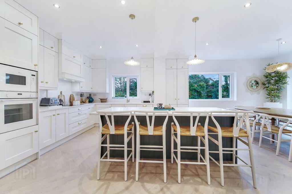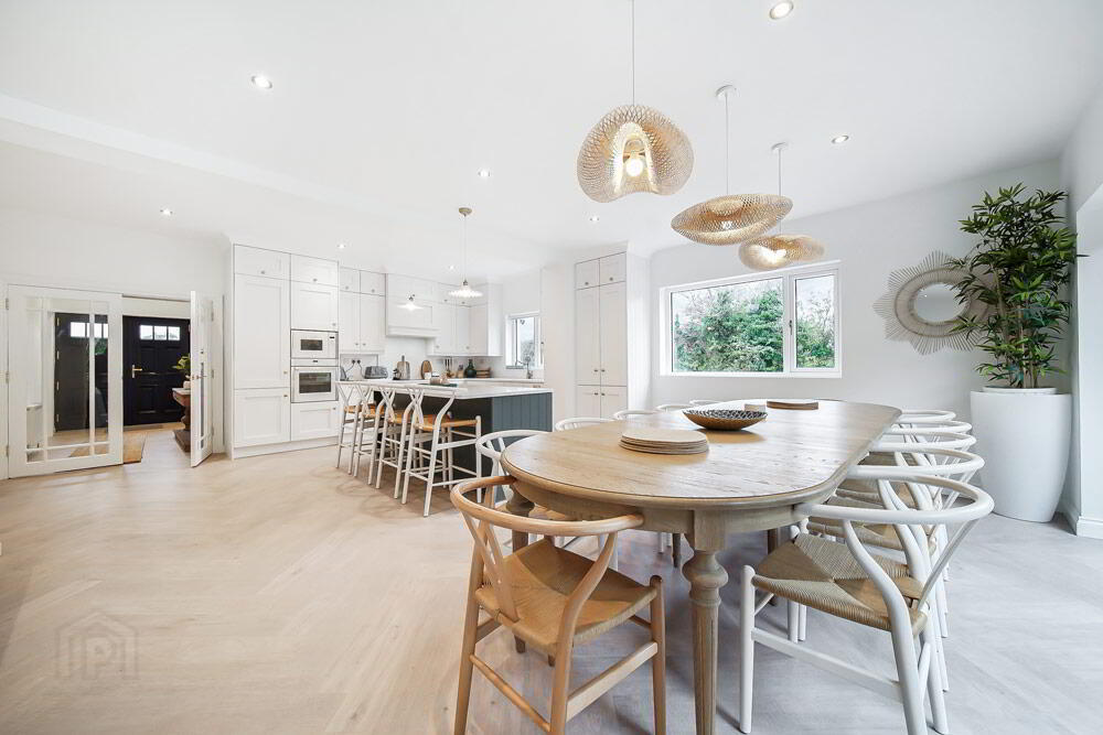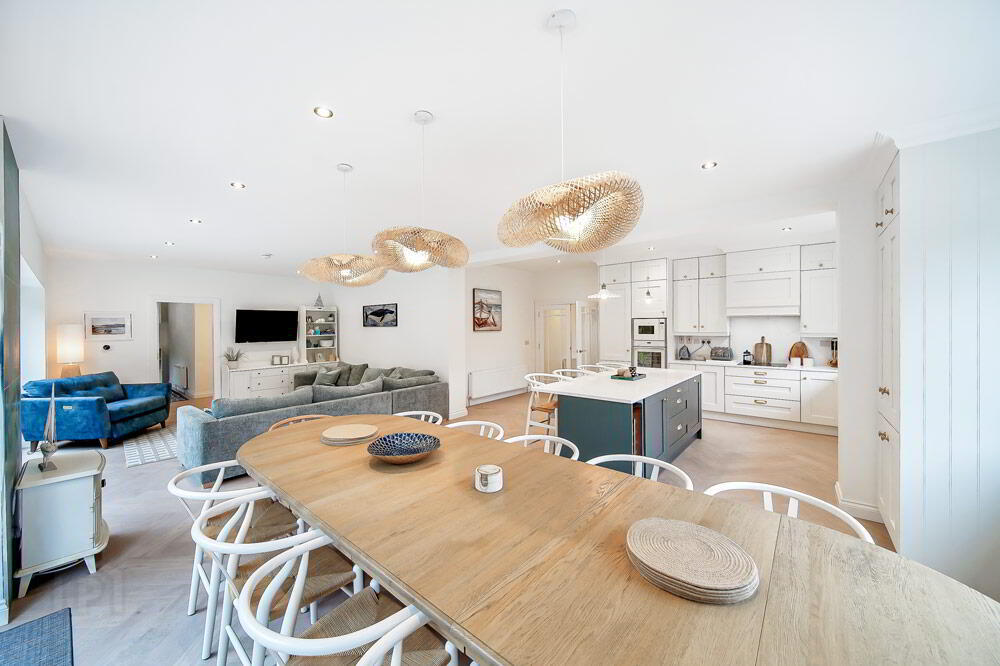7.80m x 6.00m Open plan space with fully fitted, floor to ceiling, shaker style white painted kitchen with granite worksurfaces, undermounted Belfast sink. Feature centre island painted in contrasting blue with granite worksurface and integrated wine fridge. Built in double Neff oven and integrated induction hob with overhead extractor fan. Built in microwave and Integrated fridge freezer & dishwasher. Beautifully curated ceiling lighting over dining area and island. Integrated washer/dryer. Large sliding doors to patio area.