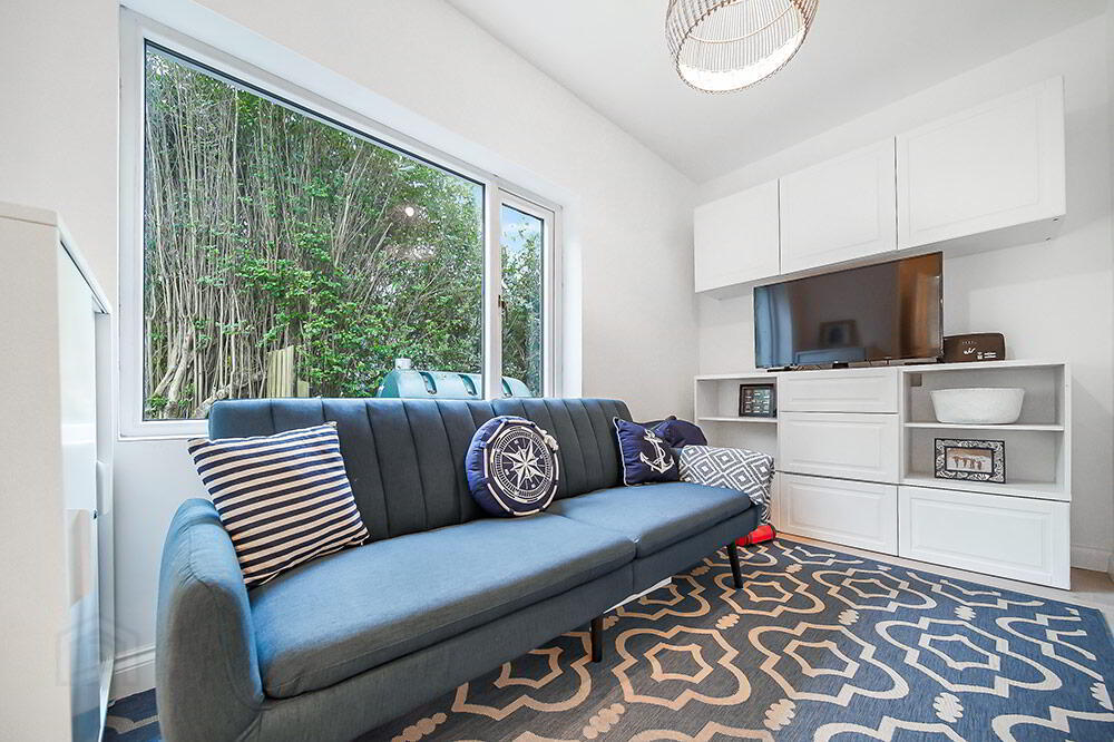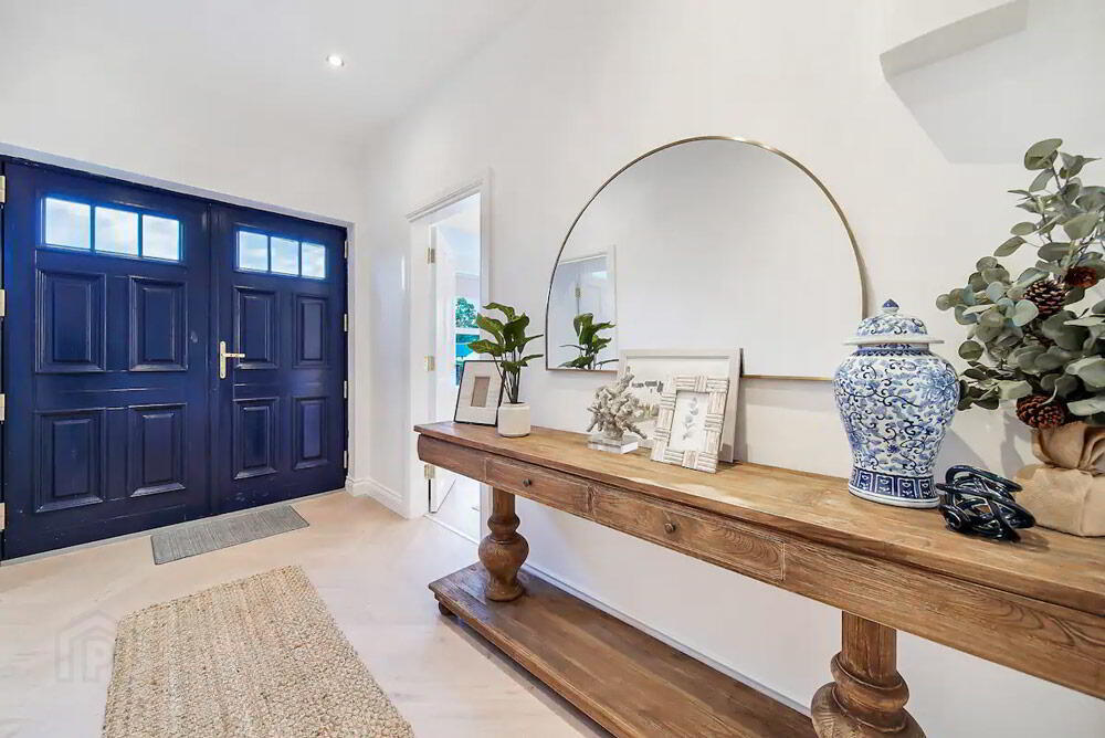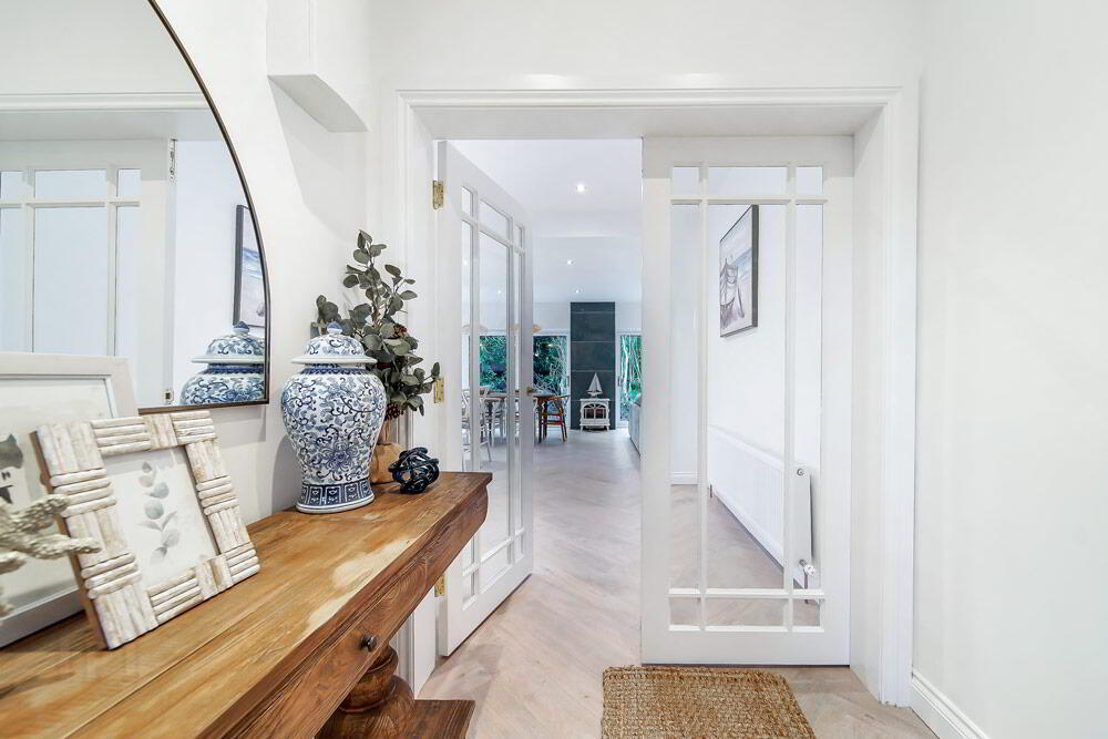 3.75m x 1.80m Navy blue double door on entrance. Double glass paneled door leading to open plan kitchen/dining/living area. Flooring in high quality herringbone pattern vinyl flooring.