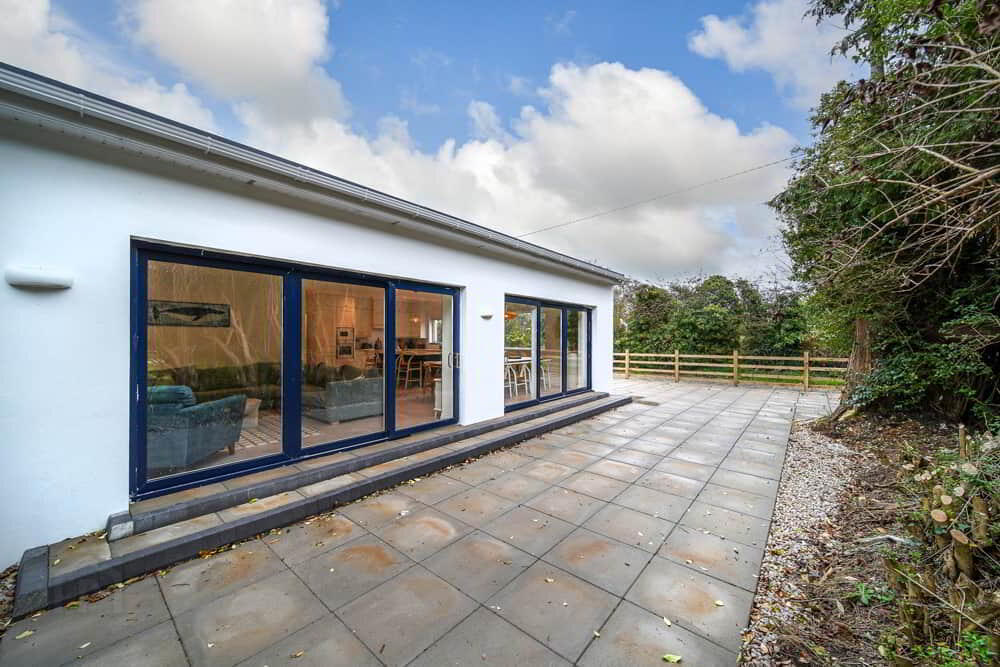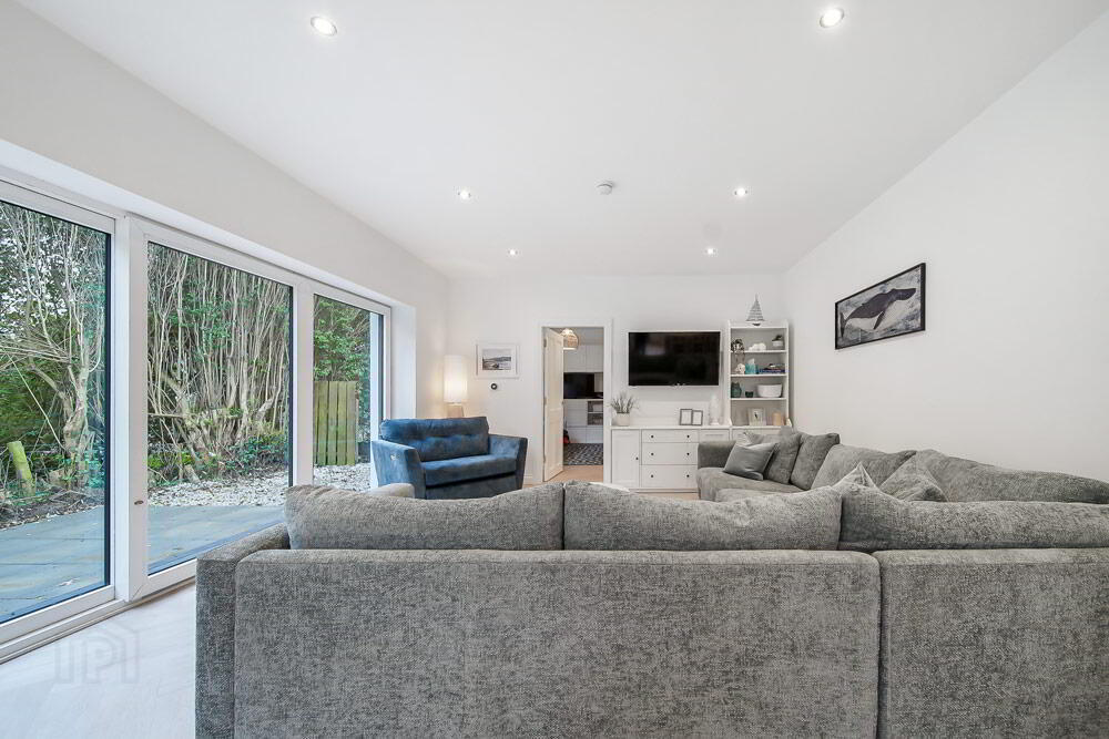 9.50m x 4.50m Open plan living space with herringbone vinyl flooring. Large room with recessed ceiling lights. Fully glazed to rear with sliding patio doors. Door leading to snug/family room.