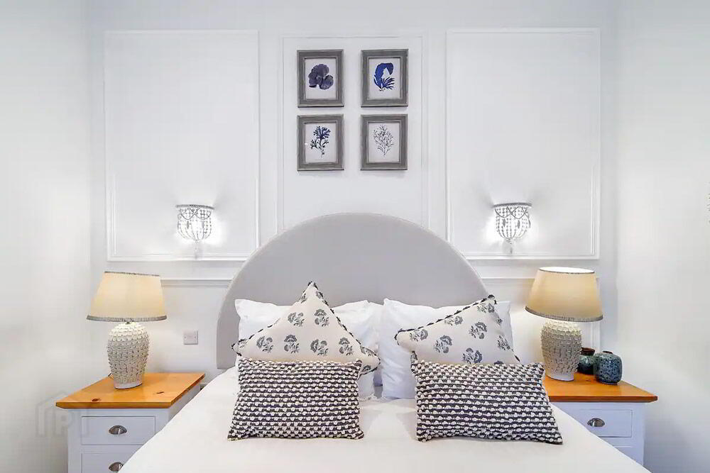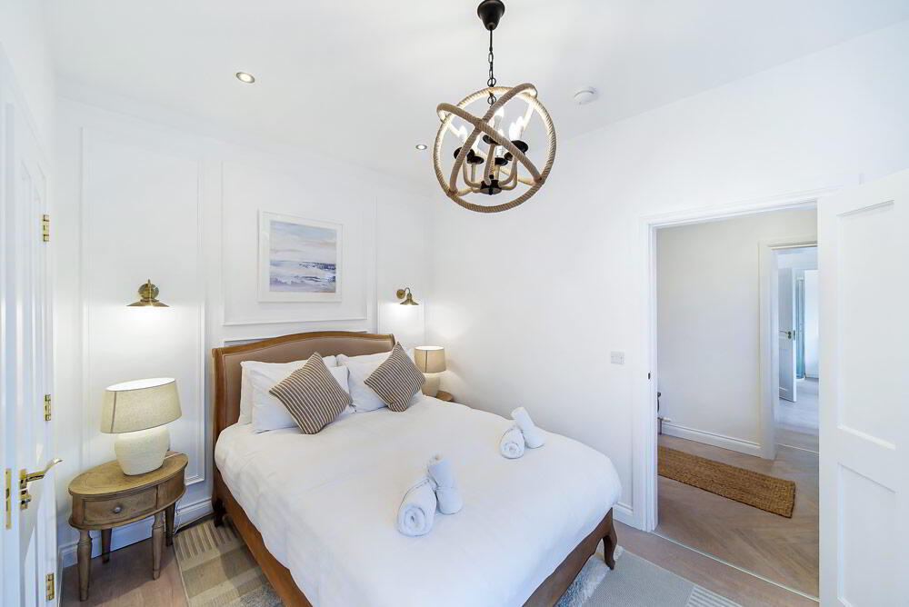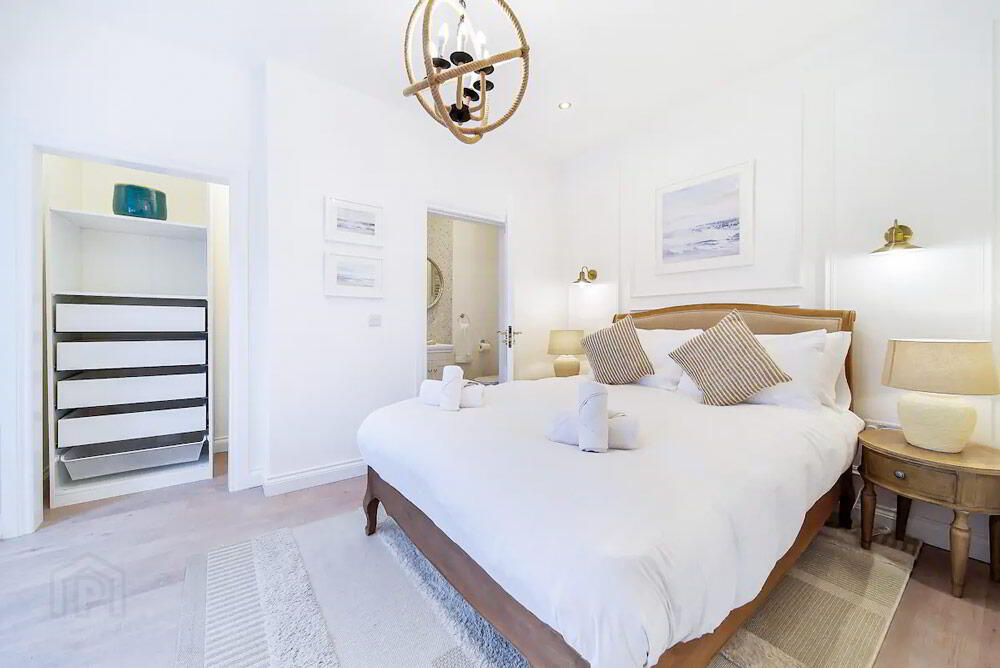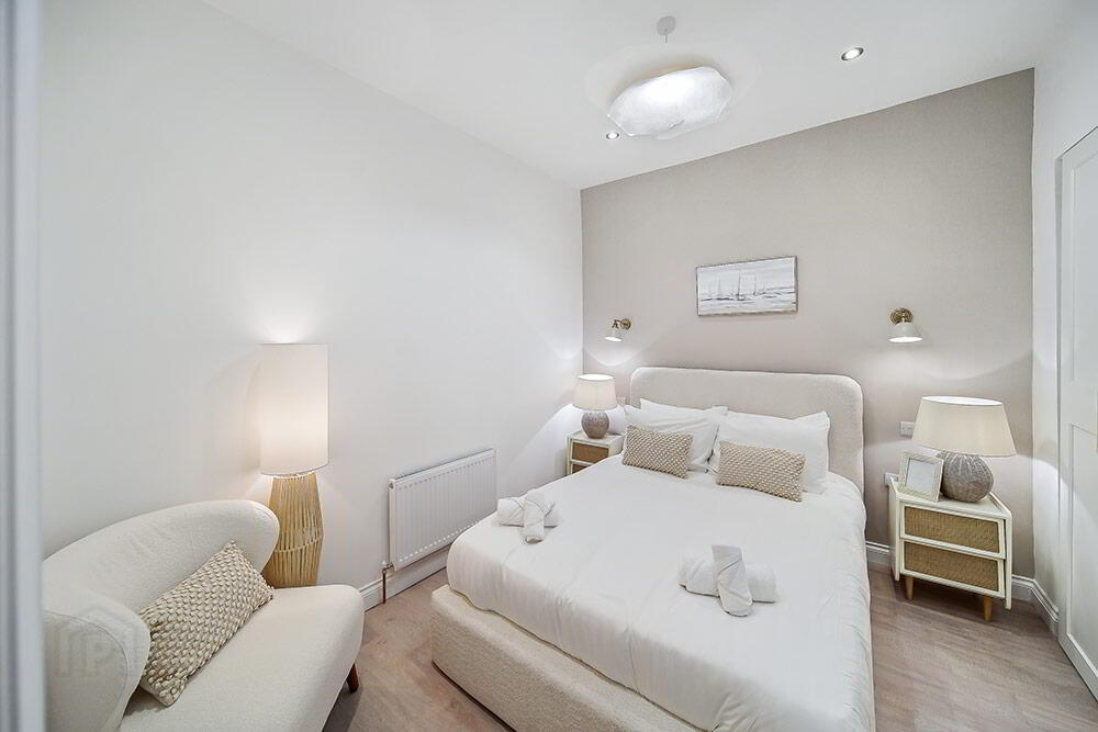4.90m x 2.80m Front facing bedroom with vinyl herringbone design flooring. Recessed lighting. Panelling to rear wall with fitted wall lights to match ceiling light. Alcove for fitted wardrobes, fitted with drawer units. Leading to en-suite bathroom.