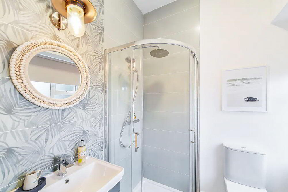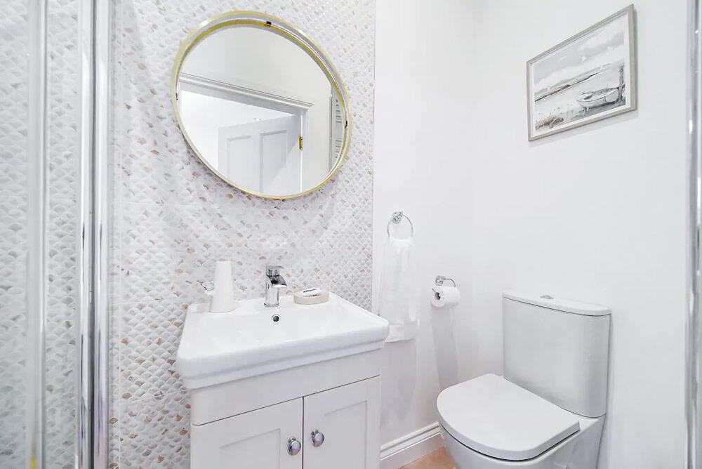 White suite with W.C., W.H.B. with storage unit underneath, fully tiled shower unit with mains rainfall shower. Heated towel rail. Feature shell design tiling in shower unit and splashback area. Fitted mirror.