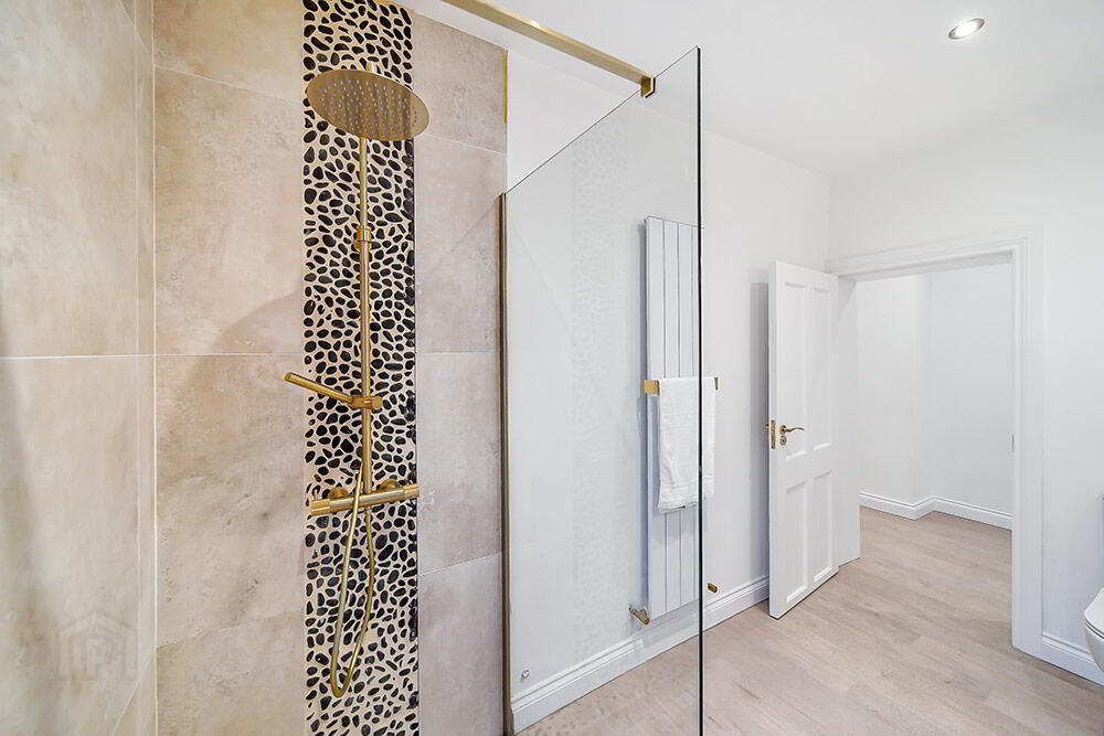 3.40m x 2.00m White bathroom suite, W.C., walk in wet room with rain shower, twin sink unit with fitted storage underneath, fitted mirrors, gold fittings, vertical radiator, recessed ceiling lighting, wall lights and herringbone effect vinyl flooring. Tiling detail in shower area and pebble mosaic finish to sink area.