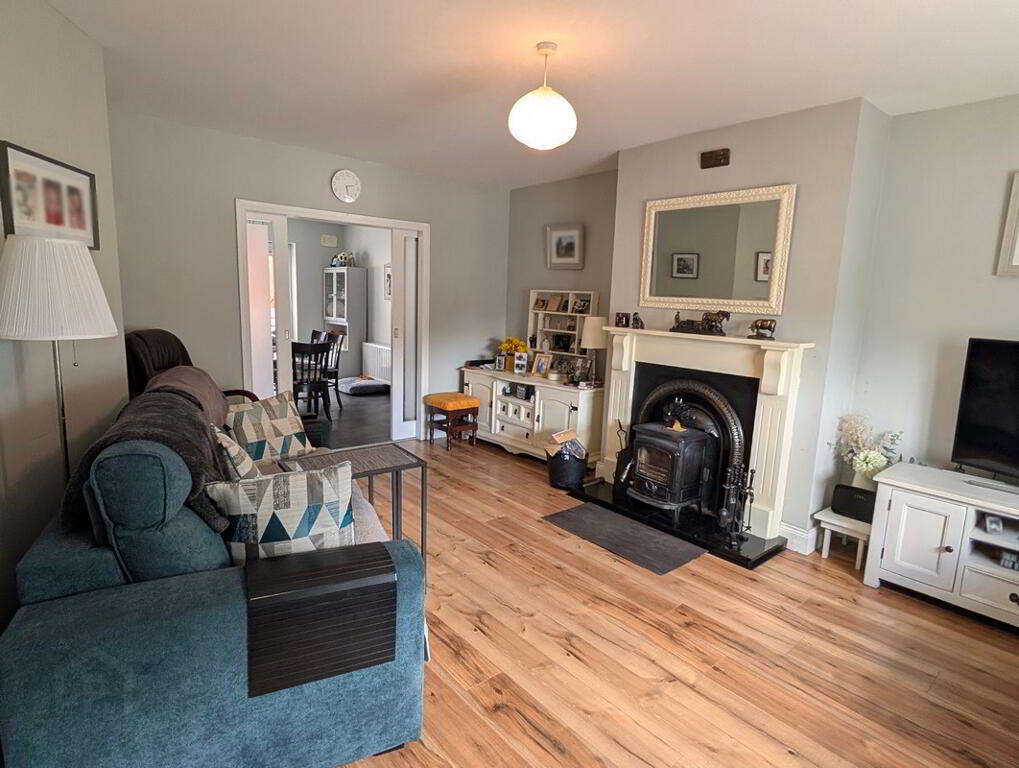Sitting Room (3.8 x 5.0) with timber floor, solid fuel stove fireplace & double pocket doors through to