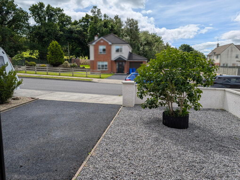 The private site is clearly bounded with a boundary wall to front & sides, complete with hedgerow to rear. To the front is a tarmacadam driveway, providing ample off street parking bordered by a low maintenance gravel bed. To the rear of property is large private garden with covered concrete patio area (6.3 x 5.5) ideal for all weather usage, Storage Shed/Utility (2.0 x 2.8), Lawn area & Garden Shed (8.0 x 6.0).