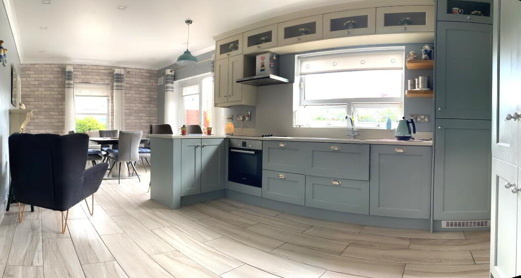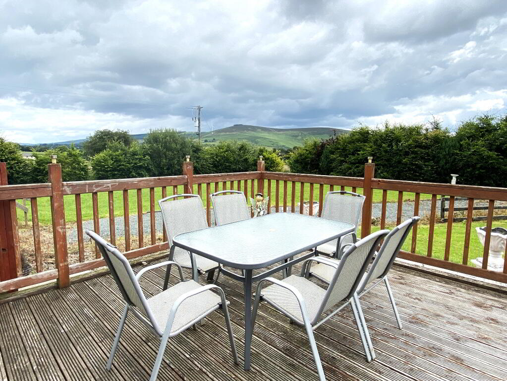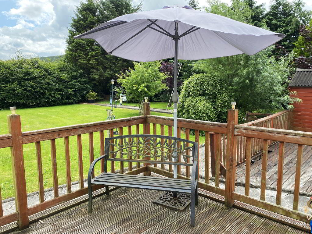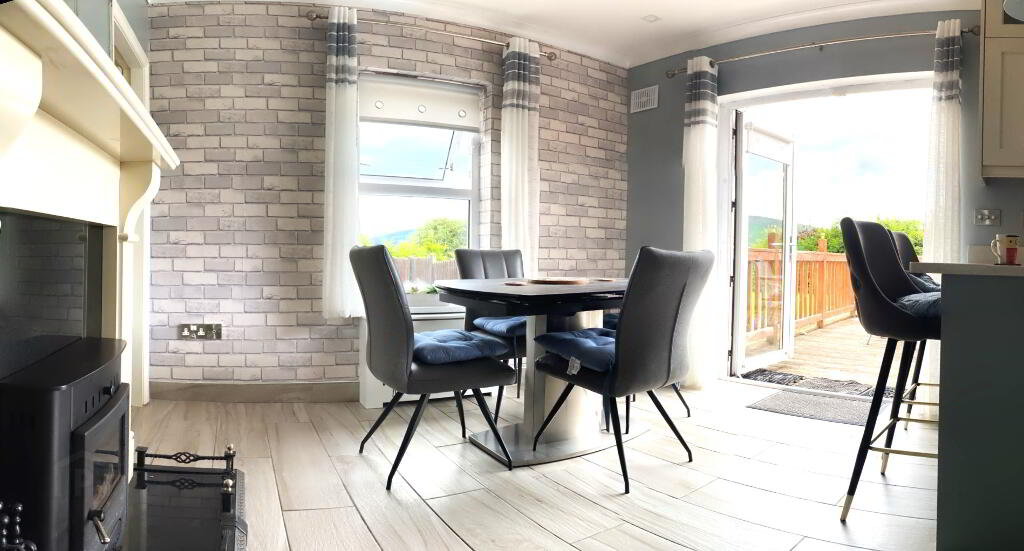 Kitchen-Living area: Fully fitted with floor and eye-level units. Solid fuel stove. Double doors to the external decking area.