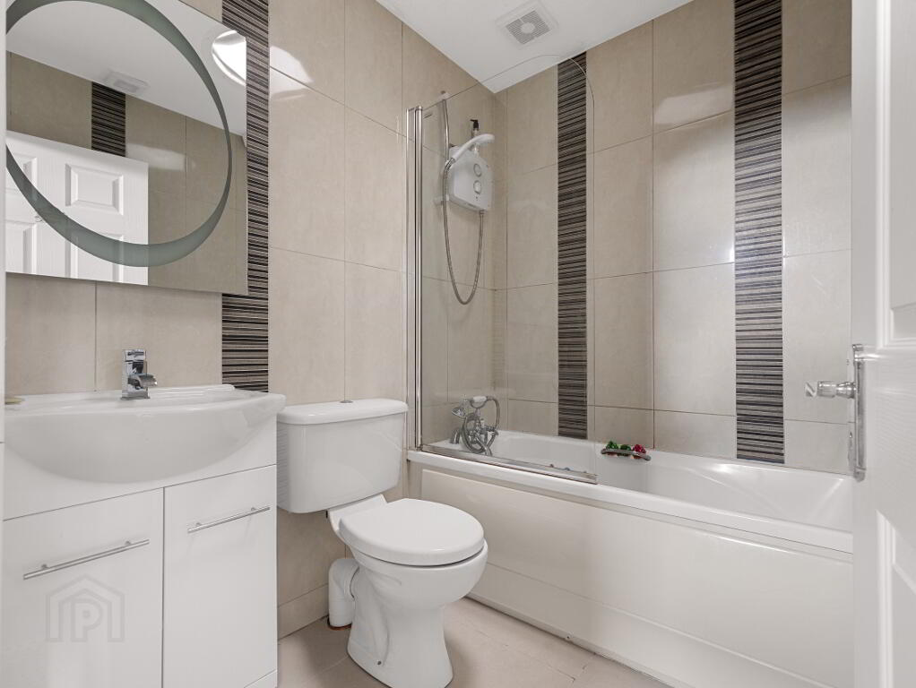Family Bathroom – 2.0m x 1.7m - Includes bath with shower overhead, WC, and WHB.