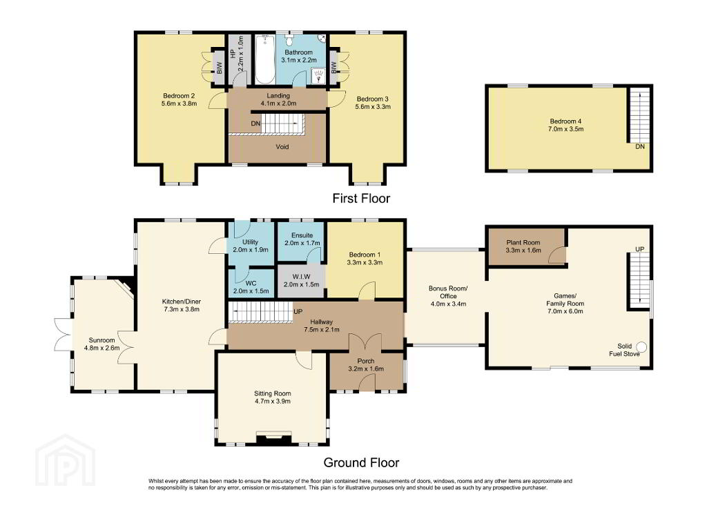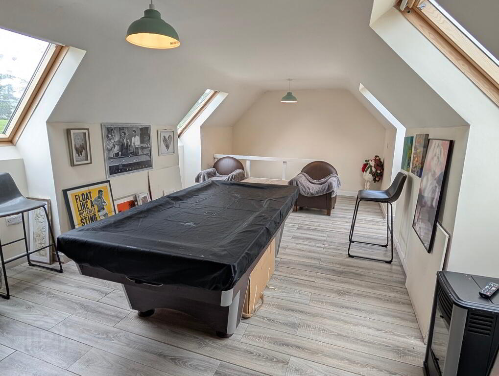 The light filled Home Office/Bonus room (3.4 x 4.0) links the main house to the Large Family /Games room (7.0 x 6.1) with solid fuel stove, double sliding door, Plant Room (3.0 x 1.6) and stairs to Bedroom 4 (3.5 x 7.0) with velux windows.